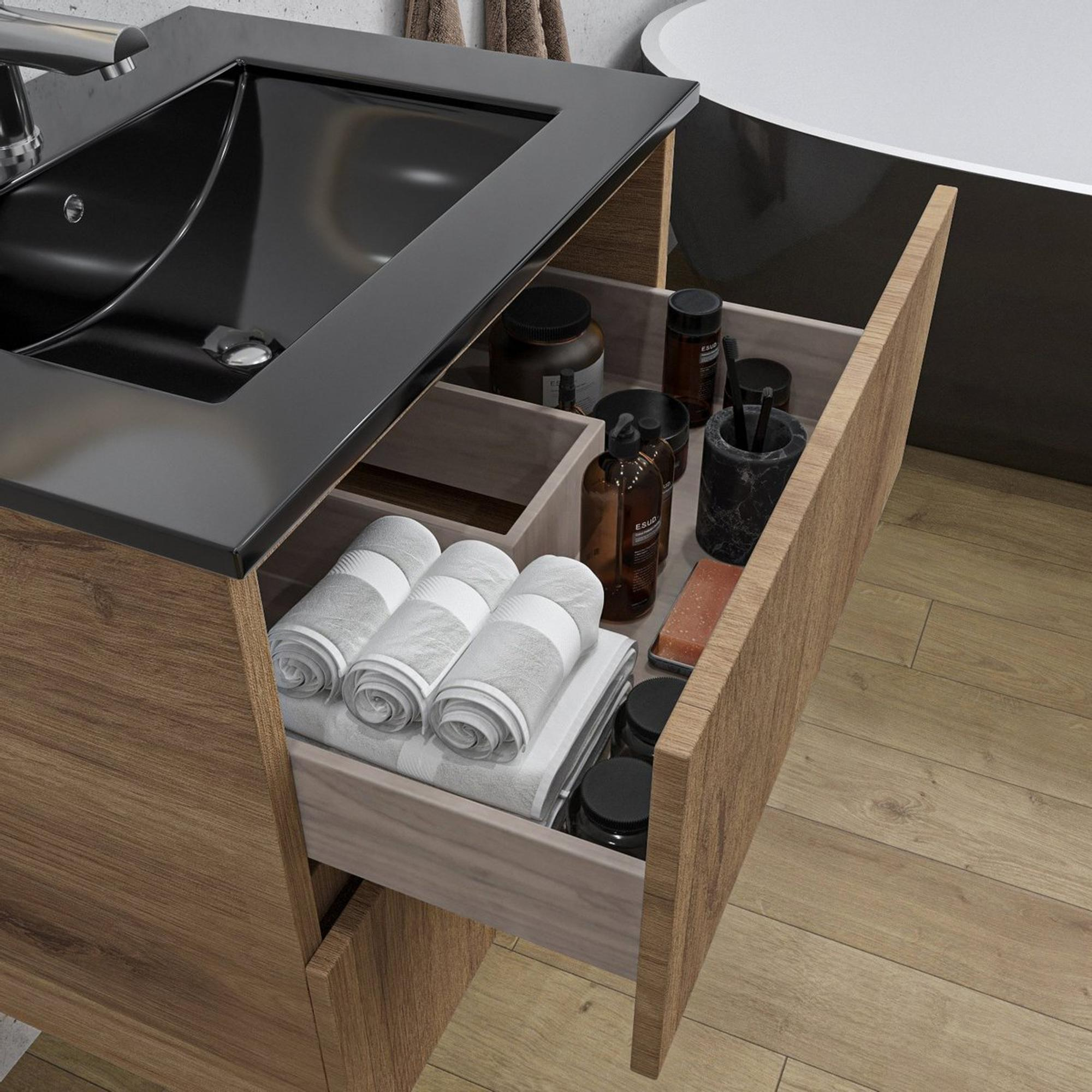 Dit badkamermeubelset straalt stijl en klasse uit. De combinatie van de zwarte keramische wasbak en de eikenkleurige lades zorgt voor een harmonieus geheel dat direct de aandacht trekt. De strakke vormgeving en hoogwaardige materialen maken dit meubelstuk een blikvanger in elke badkamer. Het is de perfecte keuze voor wie op zoek is naar een eigentijdse en elegante uitstraling.