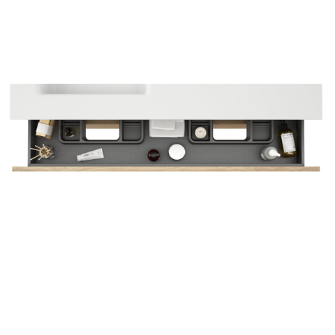 Niet alleen is dit badkamermeubelset een lust voor het oog, maar het is ook zeer functioneel. Met twee ruime lades biedt het voldoende opbergruimte voor al je badkamerbenodigdheden. De keramische wasbakken zijn slijtvast en eenvoudig schoon te maken, waardoor ze perfect zijn voor dagelijks gebruik. Bovendien zijn de wasbakken voorzien van kraangaten, waardoor je jouw favoriete kranen kunt toevoegen voor een persoonlijke touch.