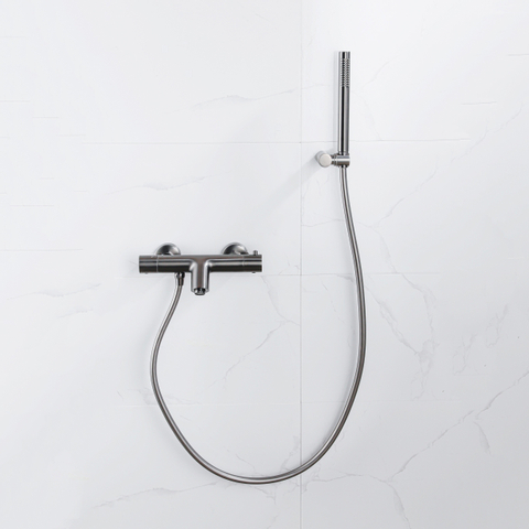 Fortifura Calvi Thermostatische badkraan met staafhanddouche, handdouchehouder en gladde doucheslang Geborsteld Gunmetal PVD