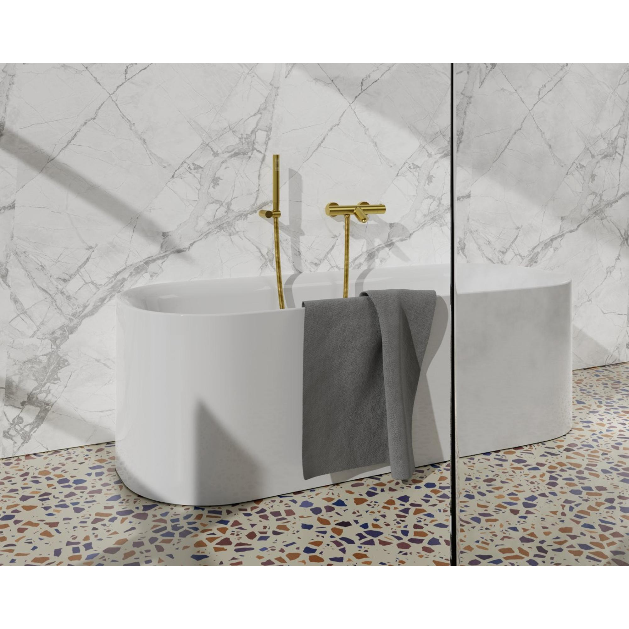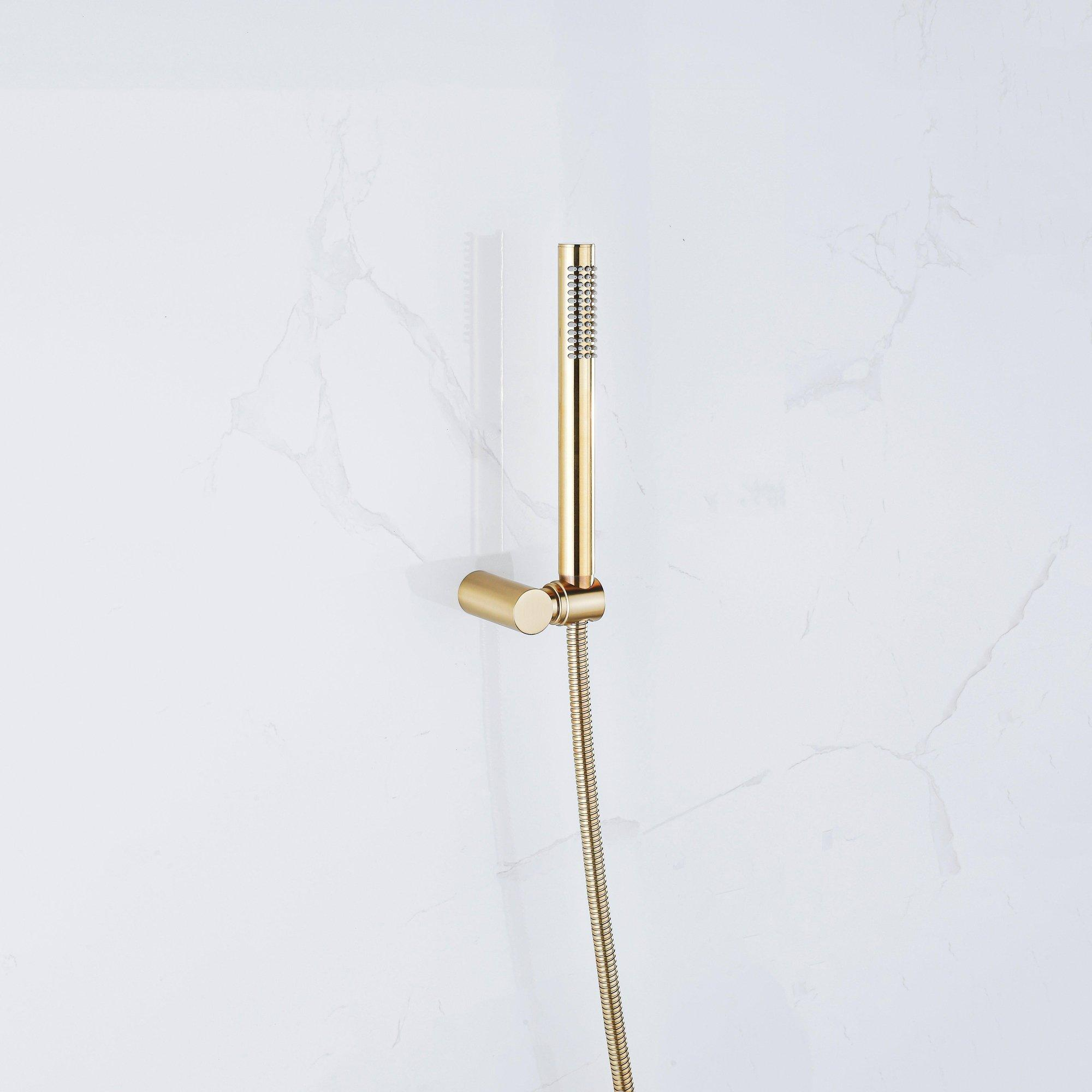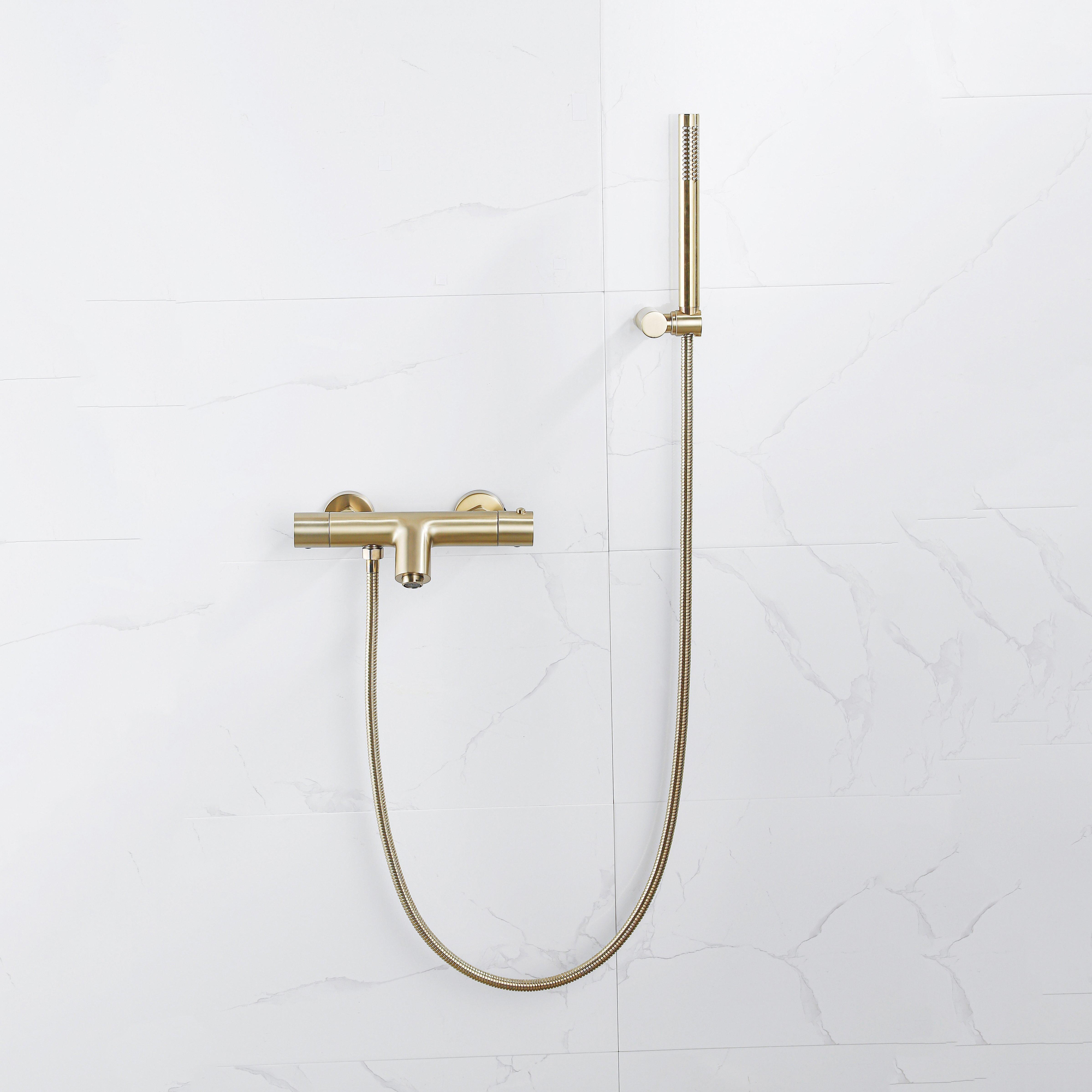 Fortifura Calvi Thermostatische badkraan met staafhanddouche, handdouchehouder en metalen doucheslang Geborsteld Messing PVD (Goud)