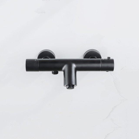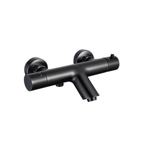 Fortifura Calvi Thermostatische badkraan met ronde handdouche, handdouchehouder en gladde doucheslang mat zwart