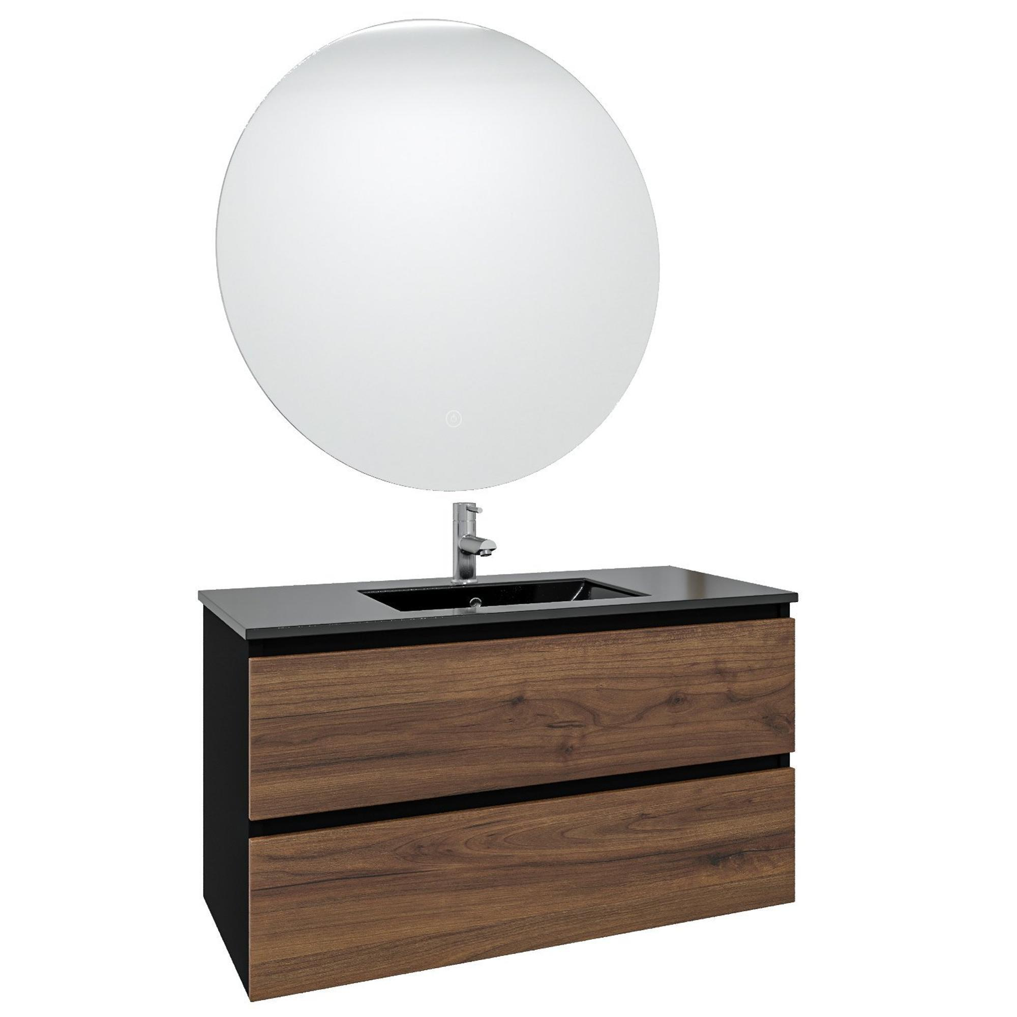 Adema Industrial 2.0 Badkamermeubelset - 100x45x55cm - 1 keramische wasbak zwart - 1 kraangat - ronde spiegel met verlichting - hout/zwart