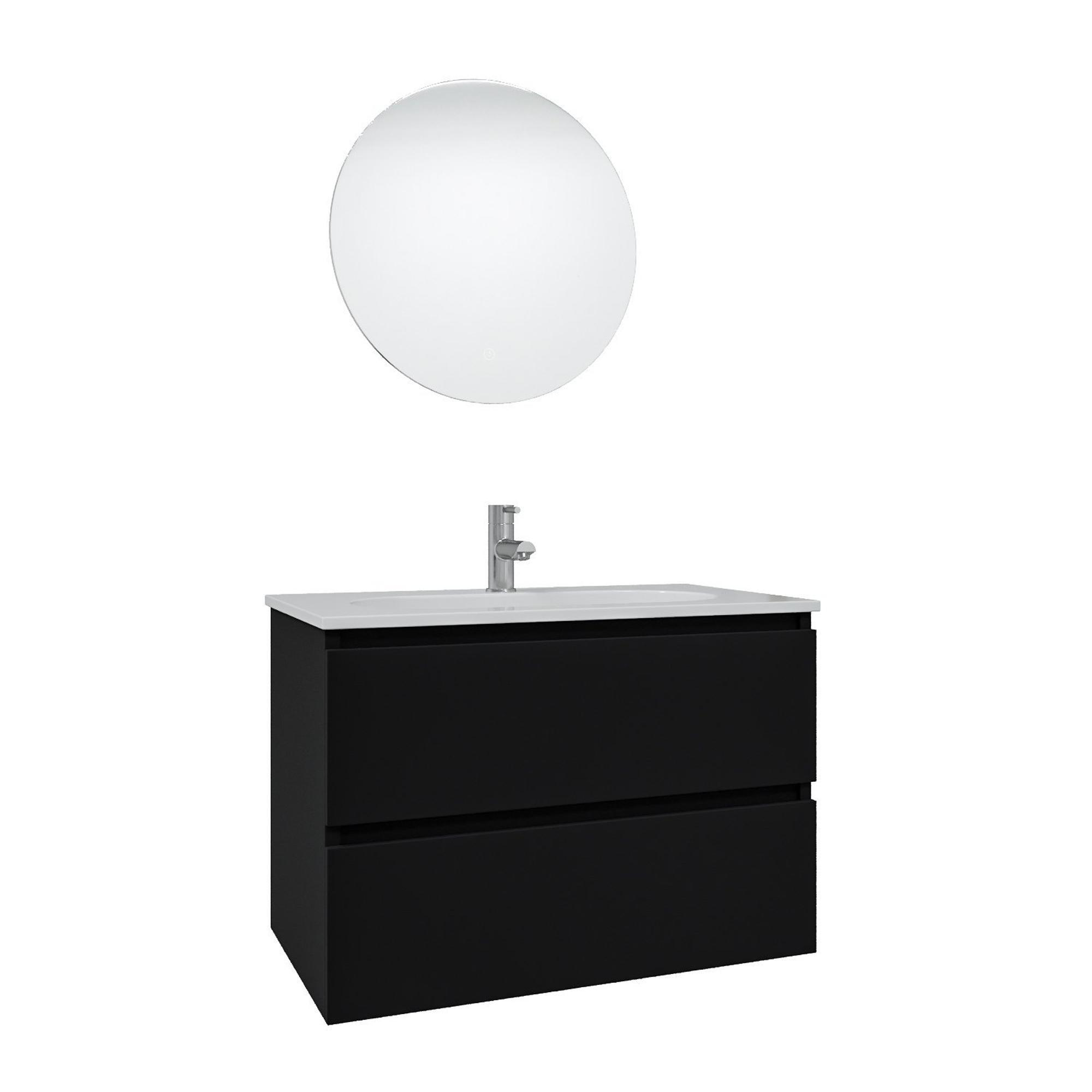 Adema Chaci Badkamermeubelset - 80x46x57cm - 1 ovale keramische wasbak wit - 1 kraangat - 2 lades - ronde spiegel met verlichting - mat zwart