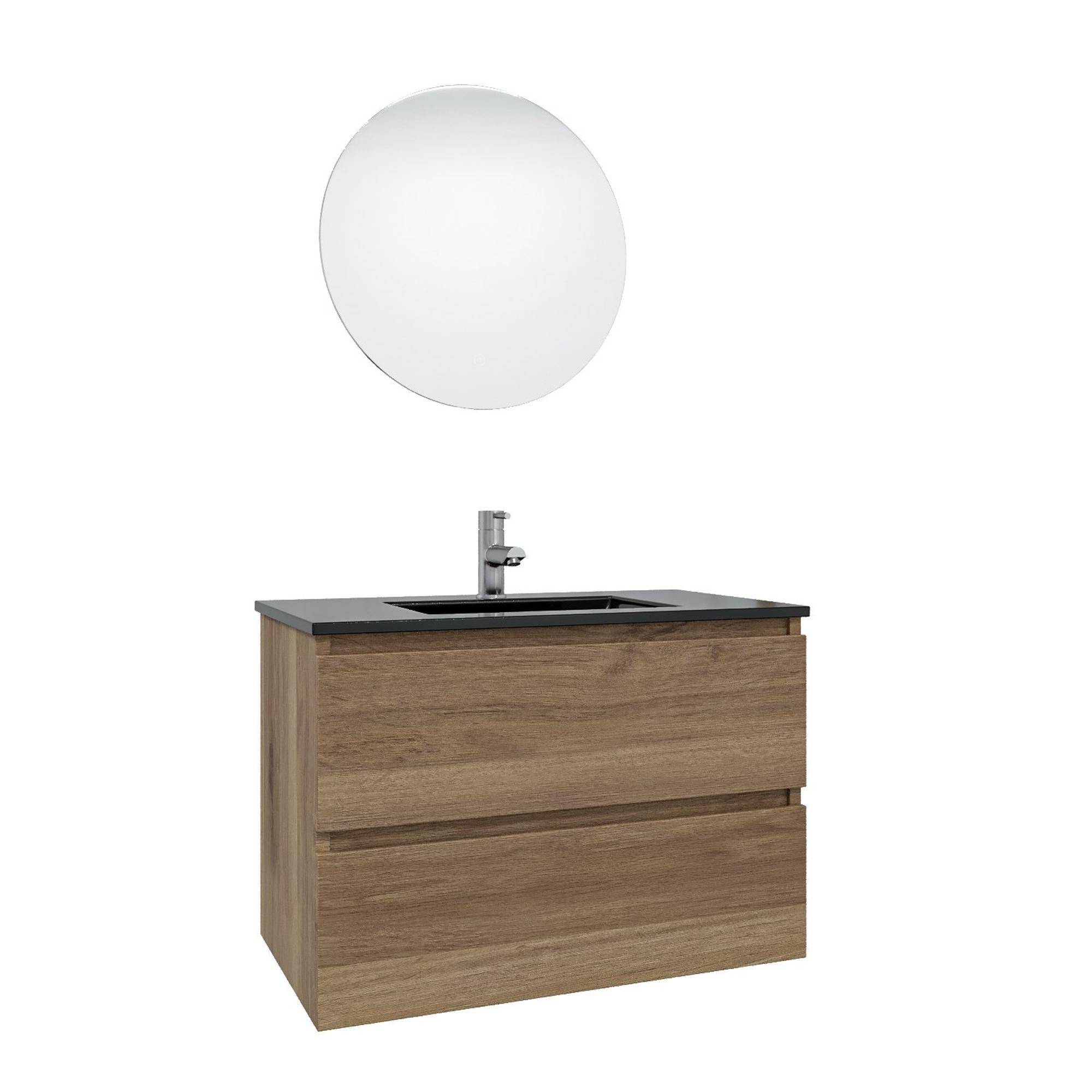 Adema Chaci Badkamermeubelset - 80x46x55cm - 1 keramische wasbak zwart - 1 kraangat - 2 lades - ronde spiegel met verlichting - eiken