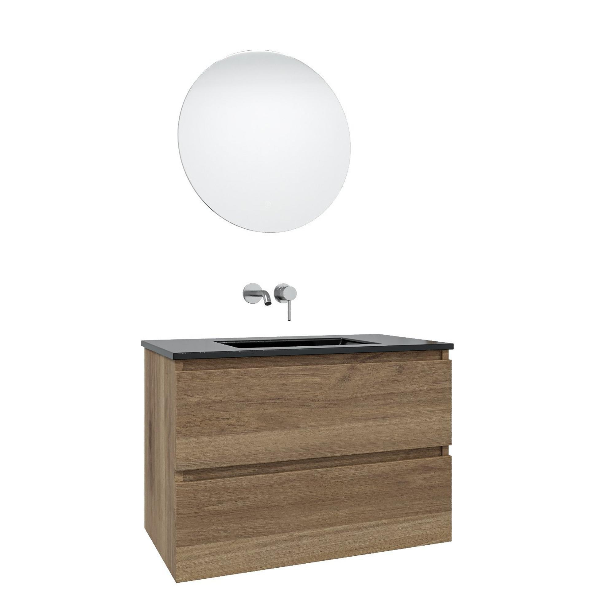 Adema Chaci Badkamermeubelset - 80x46x55cm - 1 keramische wasbak zwart - zonder kraangat - 2 lades - ronde spiegel met verlichting - eiken