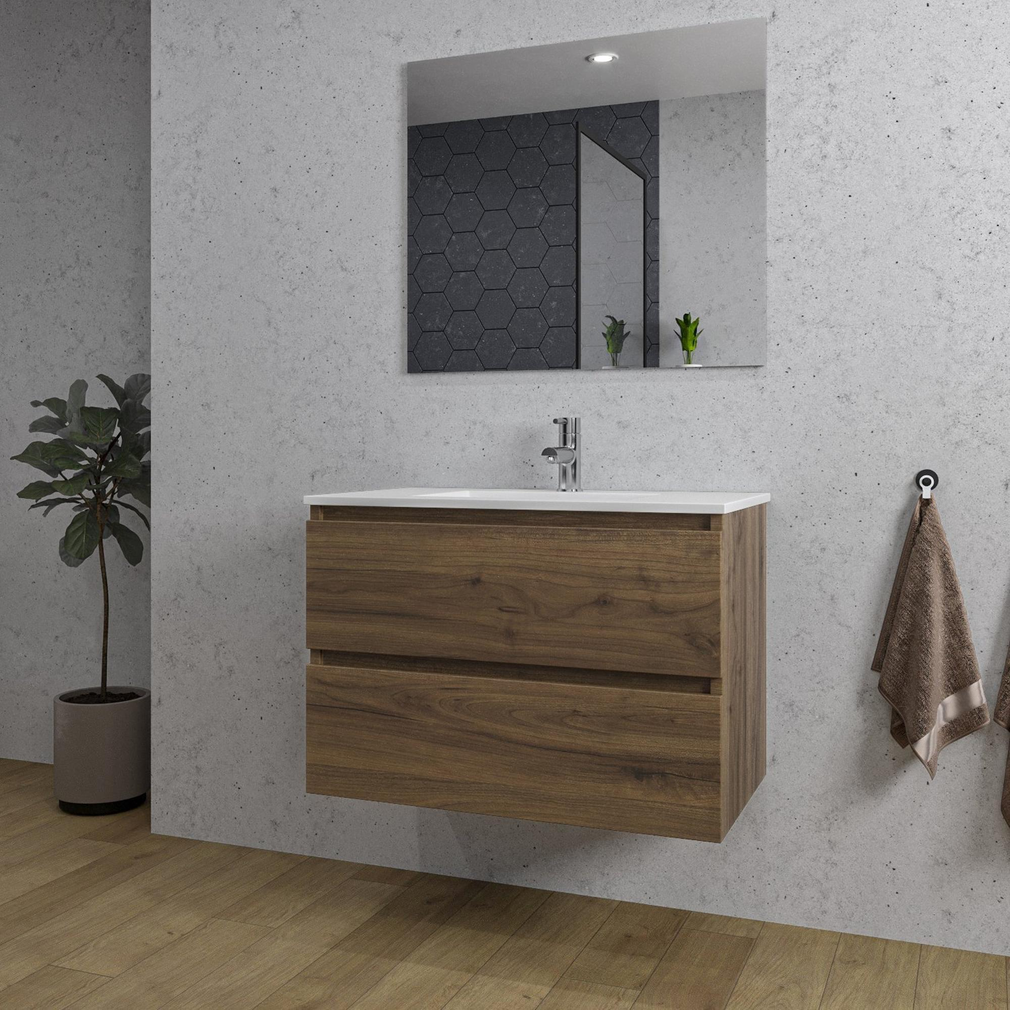 Adema Chaci Badkamermeubelset - 80x46x55cm - 1 keramische wasbak wit - 1 kraangat - 2 lades - rechthoekige spiegel - noten (hout)