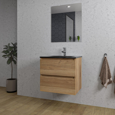 Adema Chaci Badkamermeubelset - 60x46x57cm - 1 keramische wasbak zwart - 1 kraangat - 2 lades - rechthoekige spiegel - eiken