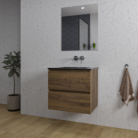 Adema Chaci Badkamermeubelset - 60x46x57cm - 1 keramische wasbak zwart - zonder kraangaten - 2 lades - rechthoekige spiegel - noten (hout)
