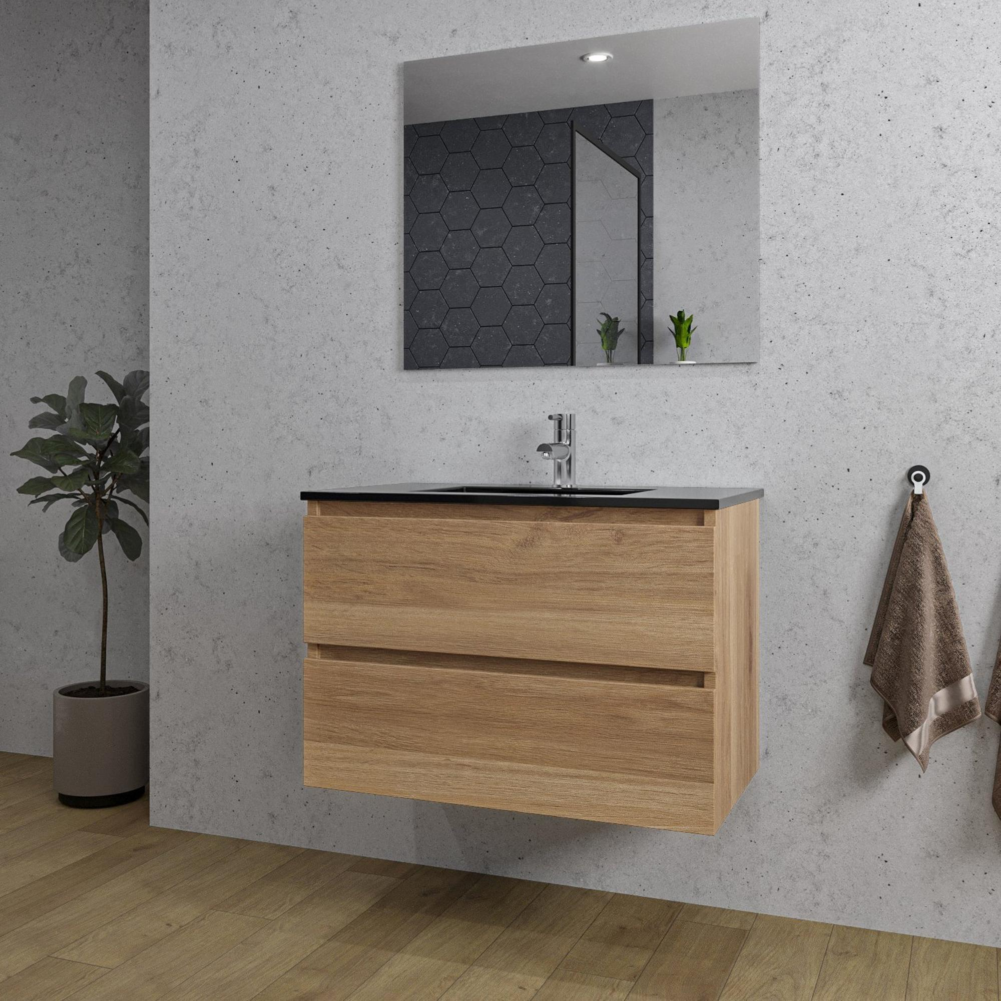Adema Chaci Badkamermeubelset - 80x46x55cm - 1 keramische wasbak zwart - 1 kraangat - 2 lades - rechthoekige spiegel - eiken