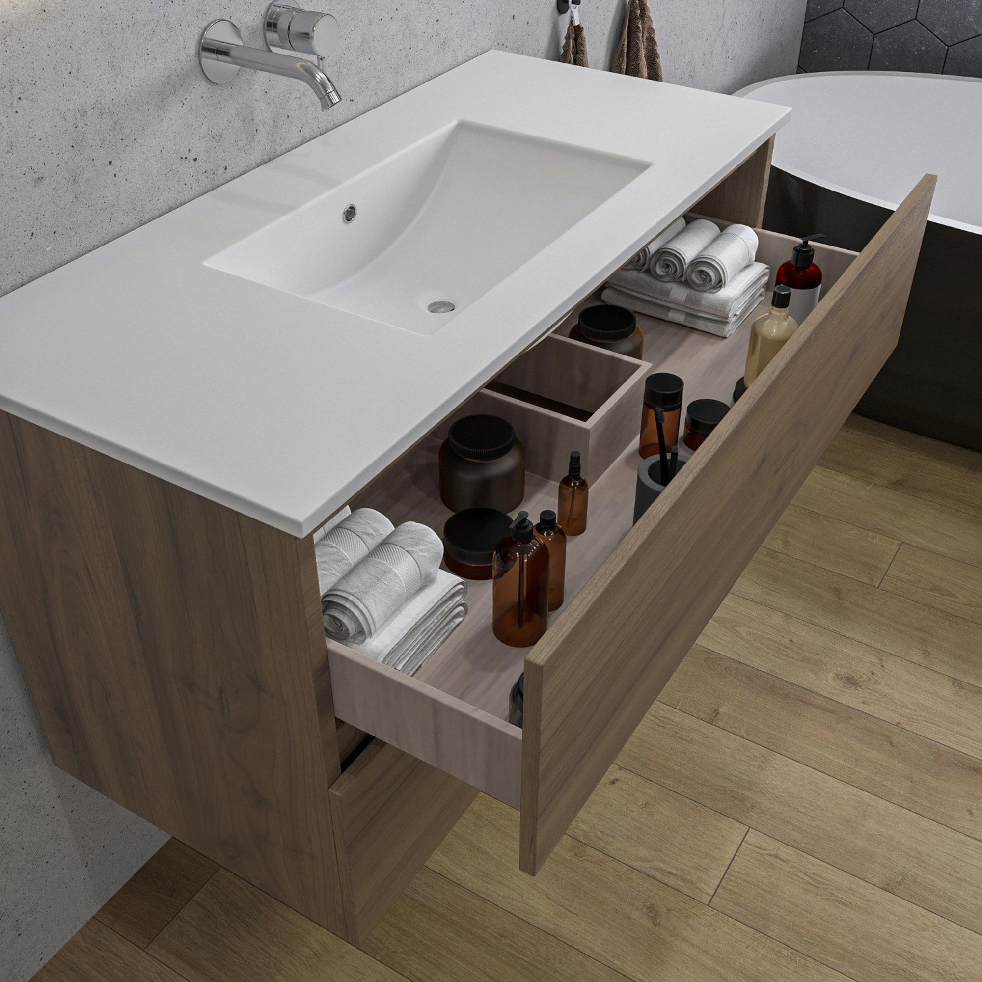 Met 2 lades biedt deze badkamermeubelset voldoende opbergruimte voor al je badkamerspullen, van handdoeken tot toiletartikelen. De slimme indeling zorgt ervoor dat alles georganiseerd en binnen handbereik is. Dankzij het compacte formaat van 100x46x57cm is dit meubel ook ideaal voor kleinere badkamers.