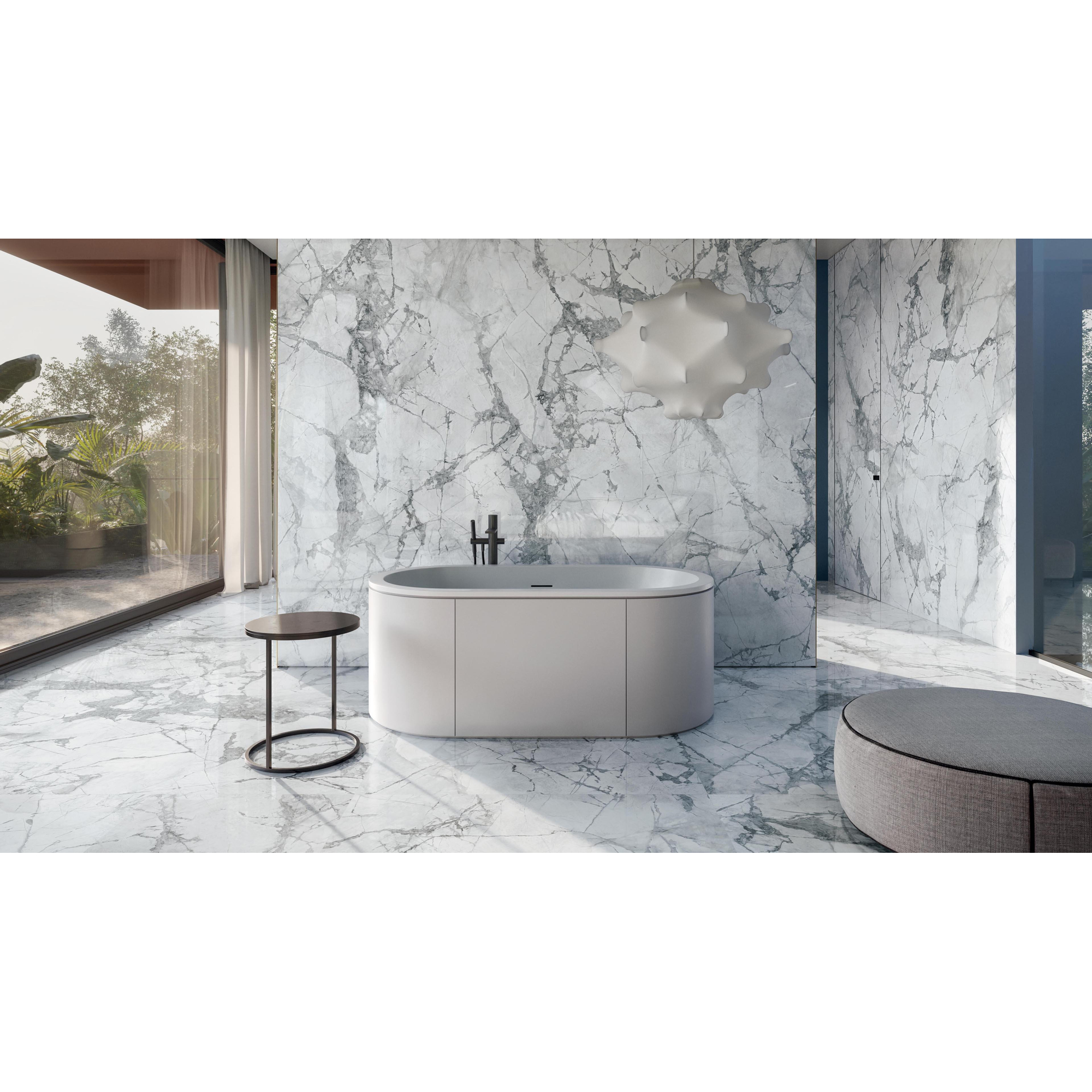 Met zijn royale afmetingen van 120x120 cm biedt deze tegel een luxueuze uitstraling die elke ruimte transformeert tot een stijlvol toevluchtsoord. De subtiele marmeren textuur en glanzende afwerking creëren een sfeer van weelde en comfort, waardoor elke dagelijkse ervaring een vleugje elegantie krijgt.