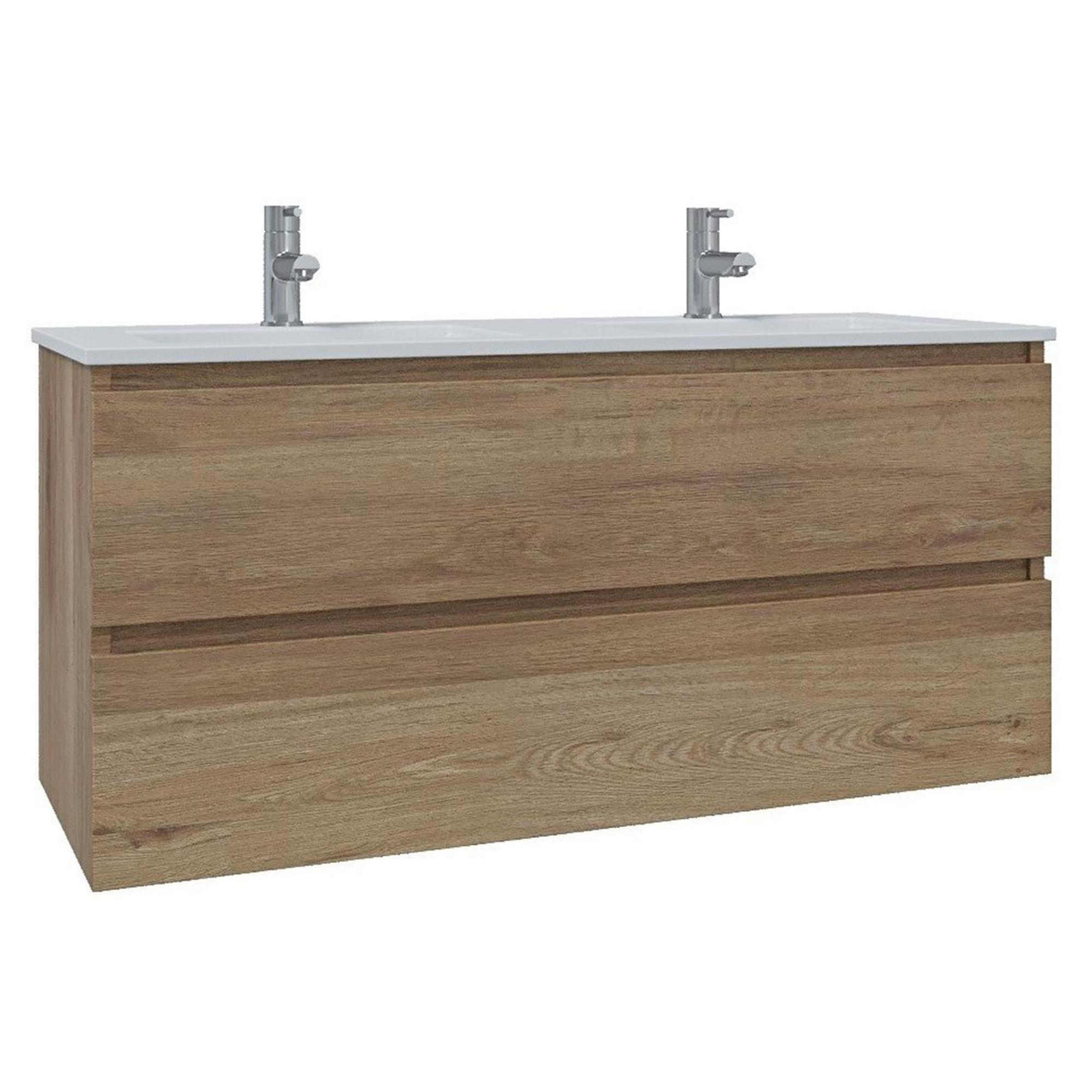 Adema Chaci Badkamermeubelset - 120x46x57cm - 2 keramische wasbakken wit - 2 kraangaten - 2 lades - Spiegelkast - eiken