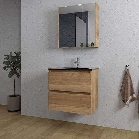 Adema Chaci Badkamermeubelset - 60x46x57cm - 1 keramische wasbak zwart - 1 kraangat - 2 lades - Spiegelkast - eiken