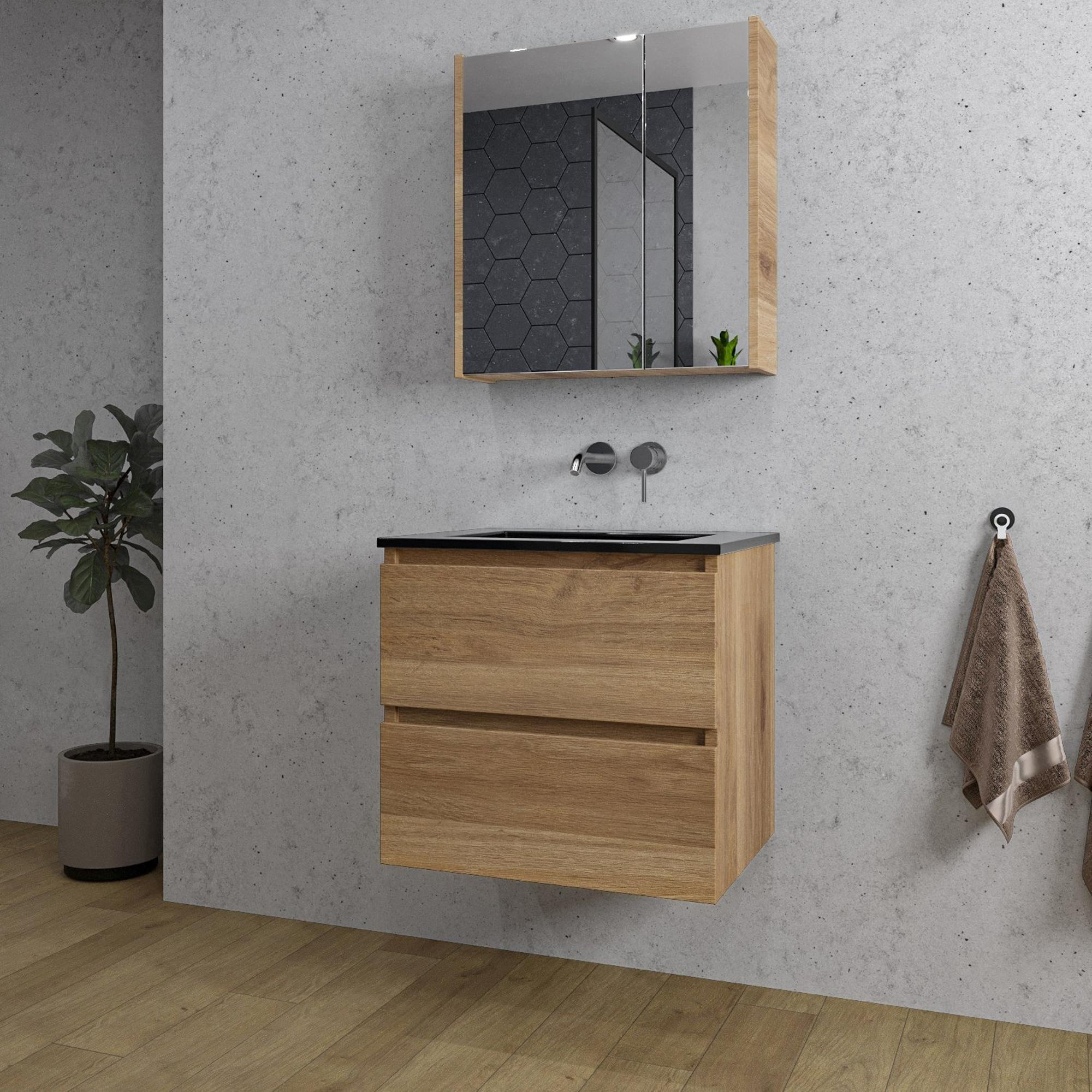 Adema Chaci Badkamermeubelset - 60x46x57cm - 1 keramische wasbak zwart - zonder kraangaten - 2 lades - Spiegelkast - eiken