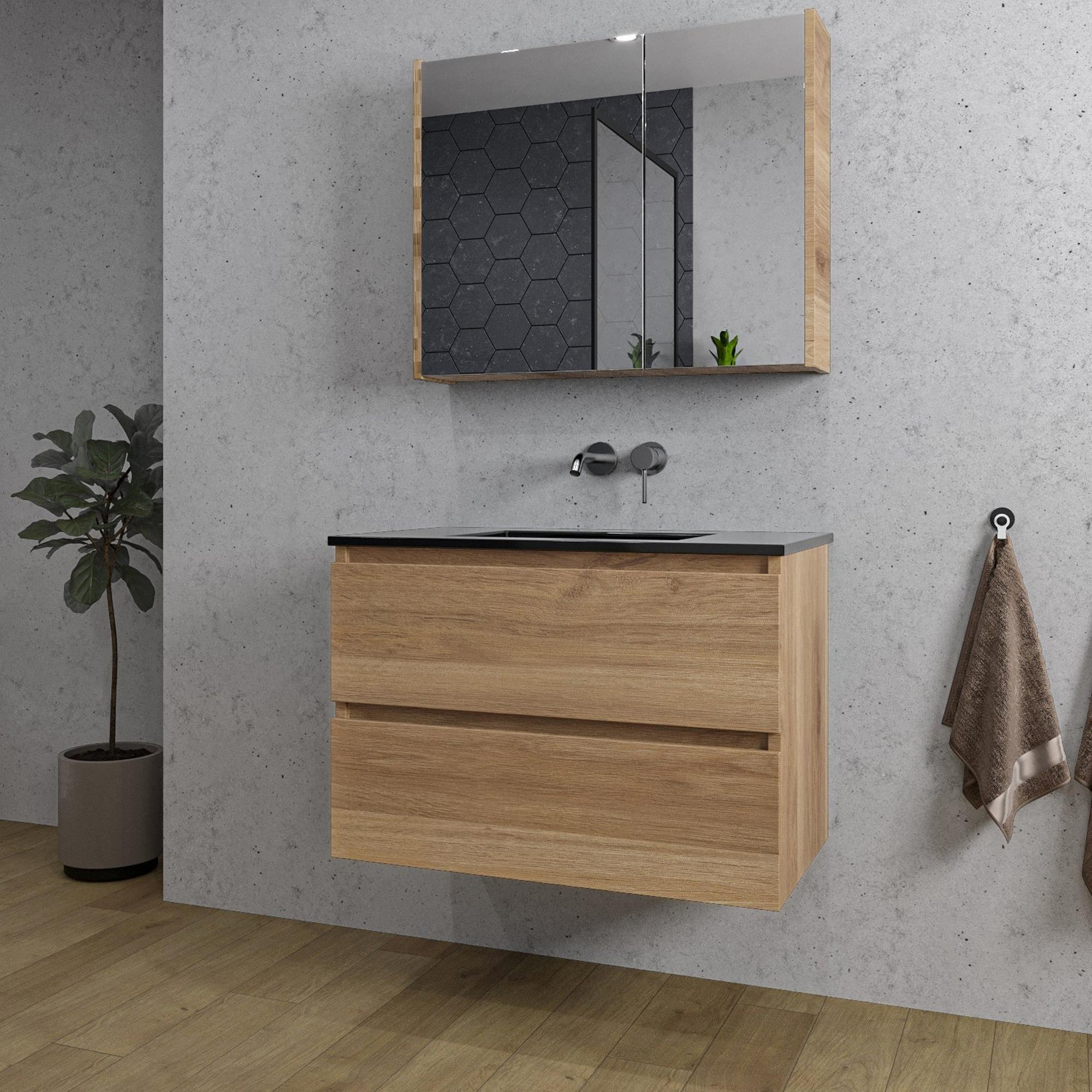 Adema Chaci Badkamermeubelset - 80x46x55cm - 1 keramische wasbak zwart - zonder kraangat - 2 lades - Spiegelkast - eiken