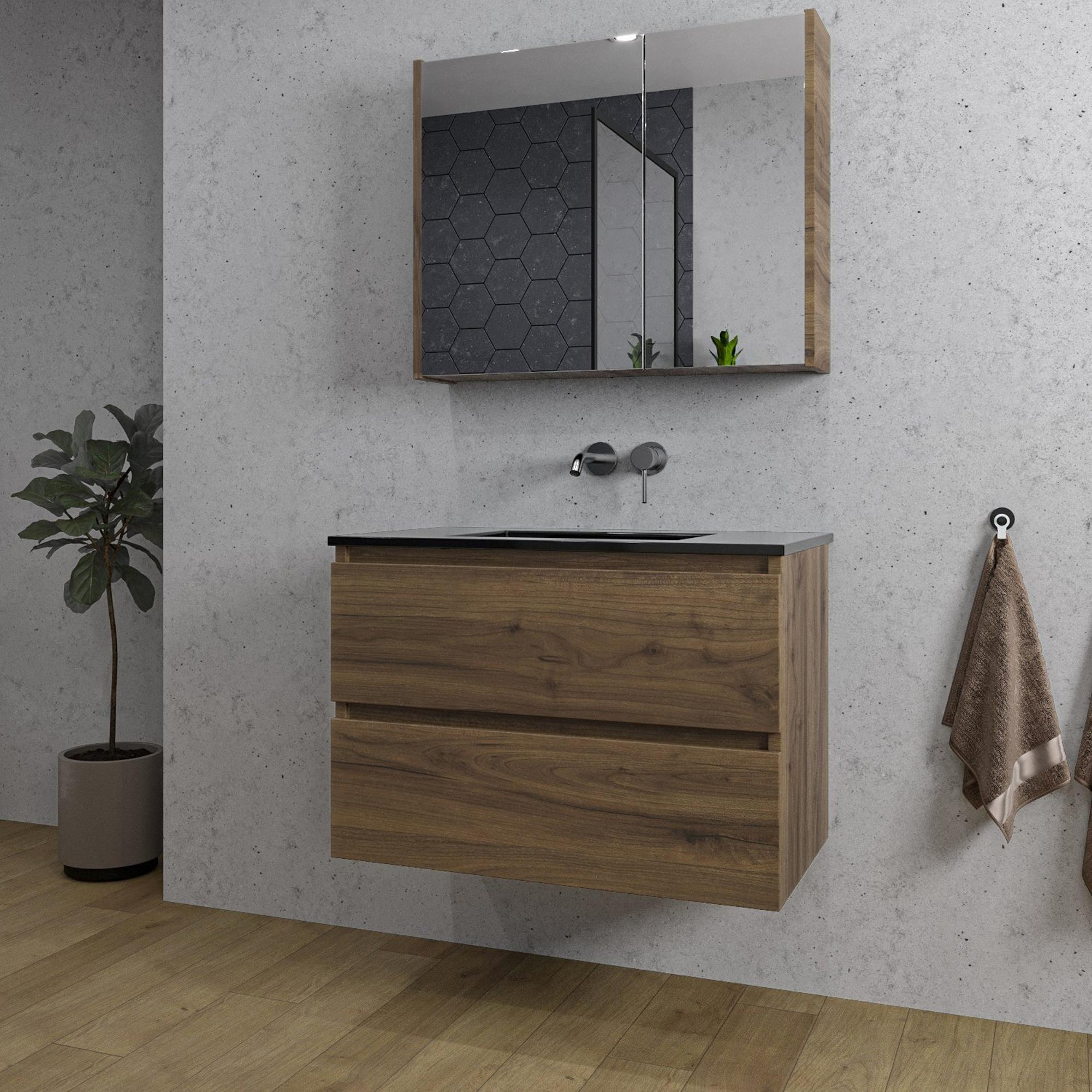 Adema Chaci Badkamermeubelset - 80x46x55cm - 1 keramische wasbak zwart - zonder kraangat - 2 lades - Spiegelkast - noten (hout)
