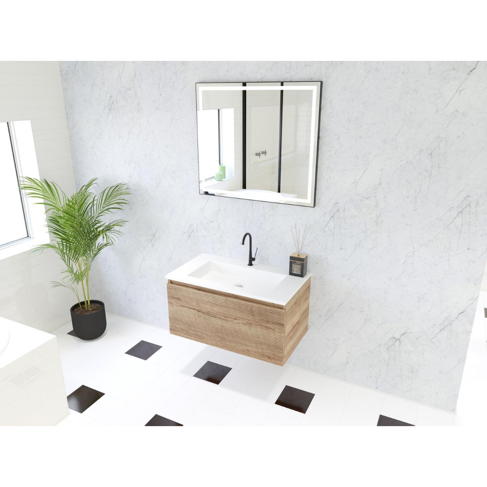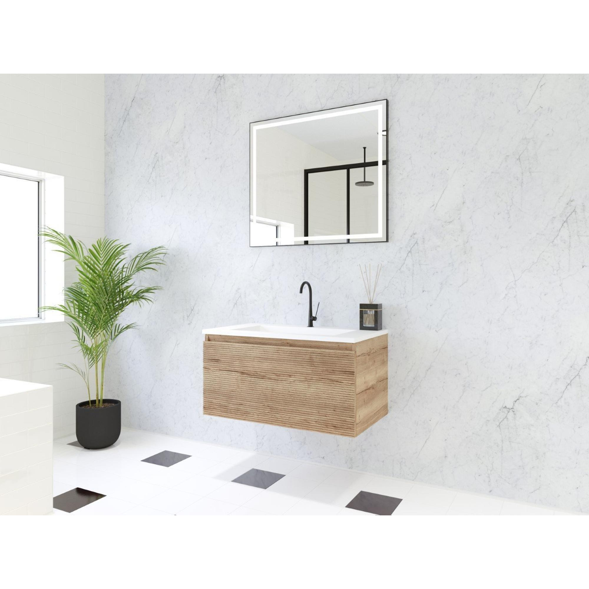 HR badmeubelen Matrix 3D badkamermeubelset 80cm 1 lade greeploos met greeplijst in kleur French oak met wasbak thin 1 kraangat wit mat