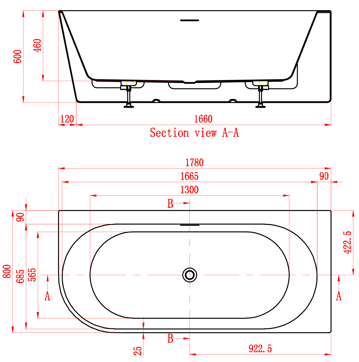 Arcqua Santo half vrijstaand ligbad 178x80cm acryl glans wit rechts. Geleverd met pop up waste in de kleur van het bad. Geintegreerde fijn geslepen overloop. Inclusief afvoerset. .