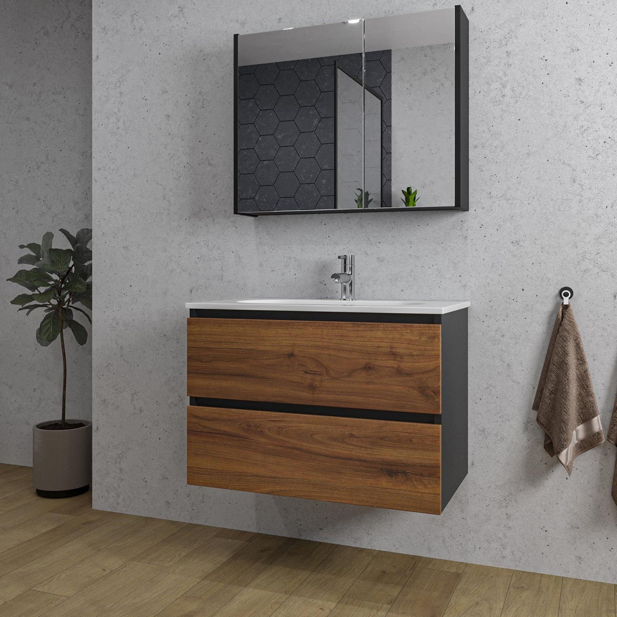 De Adema Industrial 2.0 Badkamermeubelset straalt een onmiskenbare stijlvolle flair uit. Het ontwerp is doordacht en eigentijds, met de ovale keramische wasbak als blikvanger. De combinatie van wit en zwart zorgt voor een tijdloze elegantie die elke badkamer verfraait. De zwarte spiegelkast voegt een vleugje luxe toe en biedt extra opbergruimte voor al jouw badkamerbenodigdheden. Dit meubelset is niet alleen functioneel, maar ook een statement van smaak en klasse.