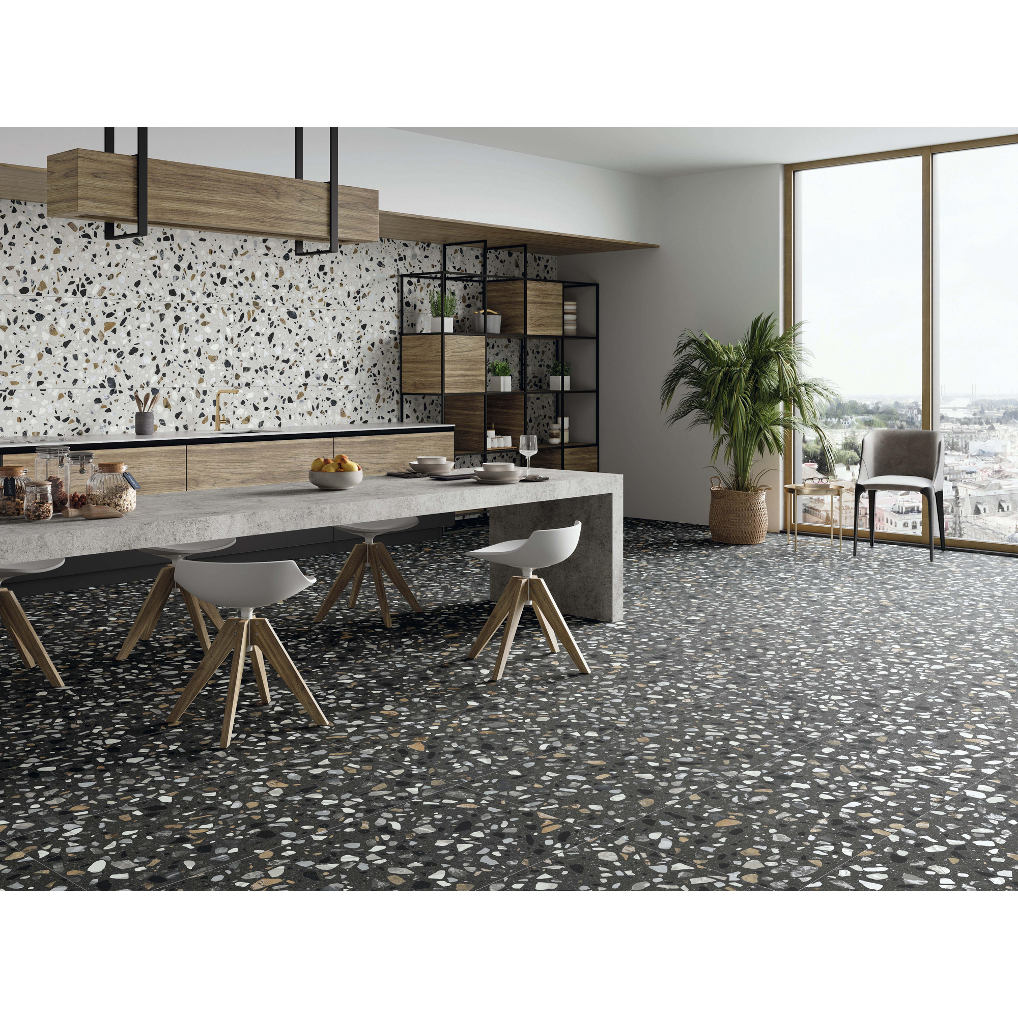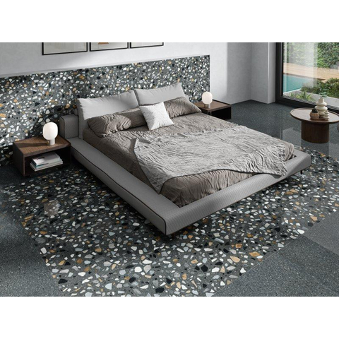 Deze tegel kan worden omschreven als prachtig vanwege zijn verfijnde ontwerp en hoogwaardige afwerking. Het Terrazzo-patroon met subtiele spikkels in combinatie met de diepe zwarte kleur zorgt voor een elegante uitstraling. Of je nu een moderne of klassieke inrichting hebt, deze tegel past perfect bij verschillende interieurstijlen en voegt een vleugje schoonheid toe aan elke ruimte.