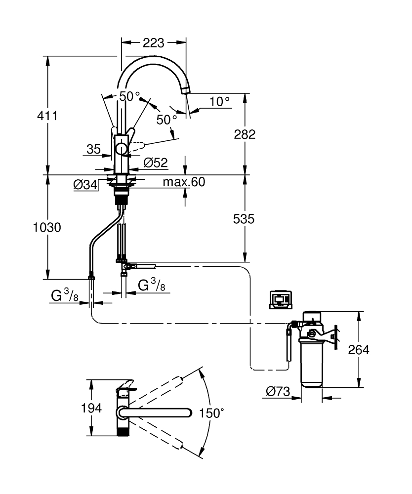 Grohe Blue pure start Curve keukenmengkraan met filterfunctie C-uitloop chroom