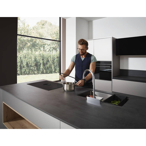 De hoge gebogen uitloop rijst boven een prominent podium uit. Dit is precies waar hansgrohe de revolutionaire SatinFlow-straalsoort heeft ondergebracht. Een zijdezachte, grote douchestraal die bestaat uit 133 ultrafijne afzonderlijke stralen, omhult voedsel op een zachte en efficiënte manier. Samen met de geleverde multifunctionele zeef F14 resulteert dit in een optimale workflow en wordt het werken in de keuken een plezier.