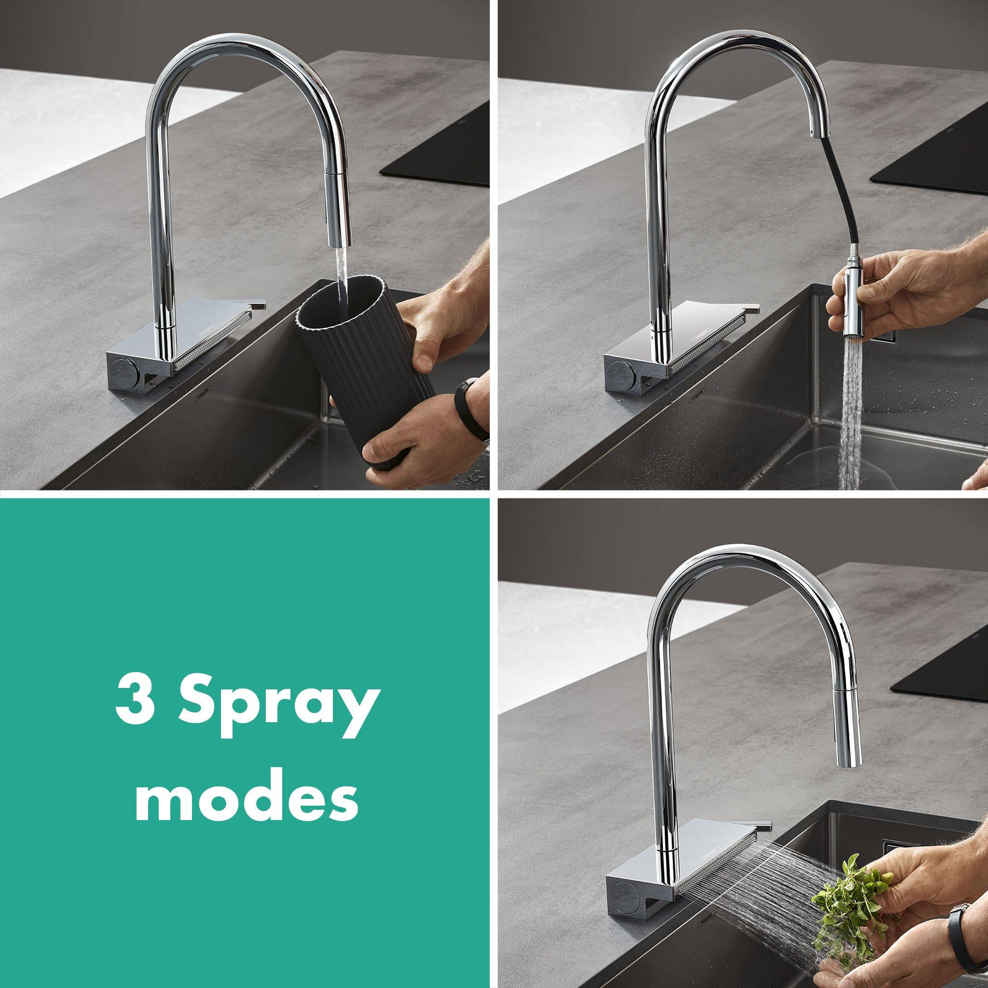 Drie precies op elkaar afgestemde straalsoorten voor een optimaal watergebruik: De kristalheldere laminaire straal vult pannen in een handomdraai. SatinFlow reinigt zacht en spatvrij. De douchestraal uit de uittrekbare uitloop is precies en zuinig.