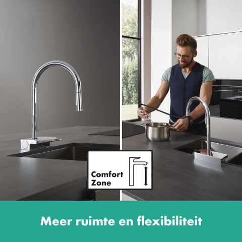 Wereldprimeur: hansgrohe keukenmengkraan met vlakke douchestraal en sBox