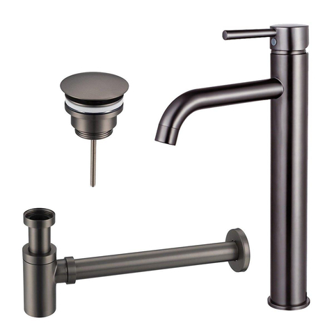 Fortifura Calvi Wastafelkraanset - verhoogde wastafelkraan - always open plug - verlaagde design sifon - Geborsteld Gunmetal PVD