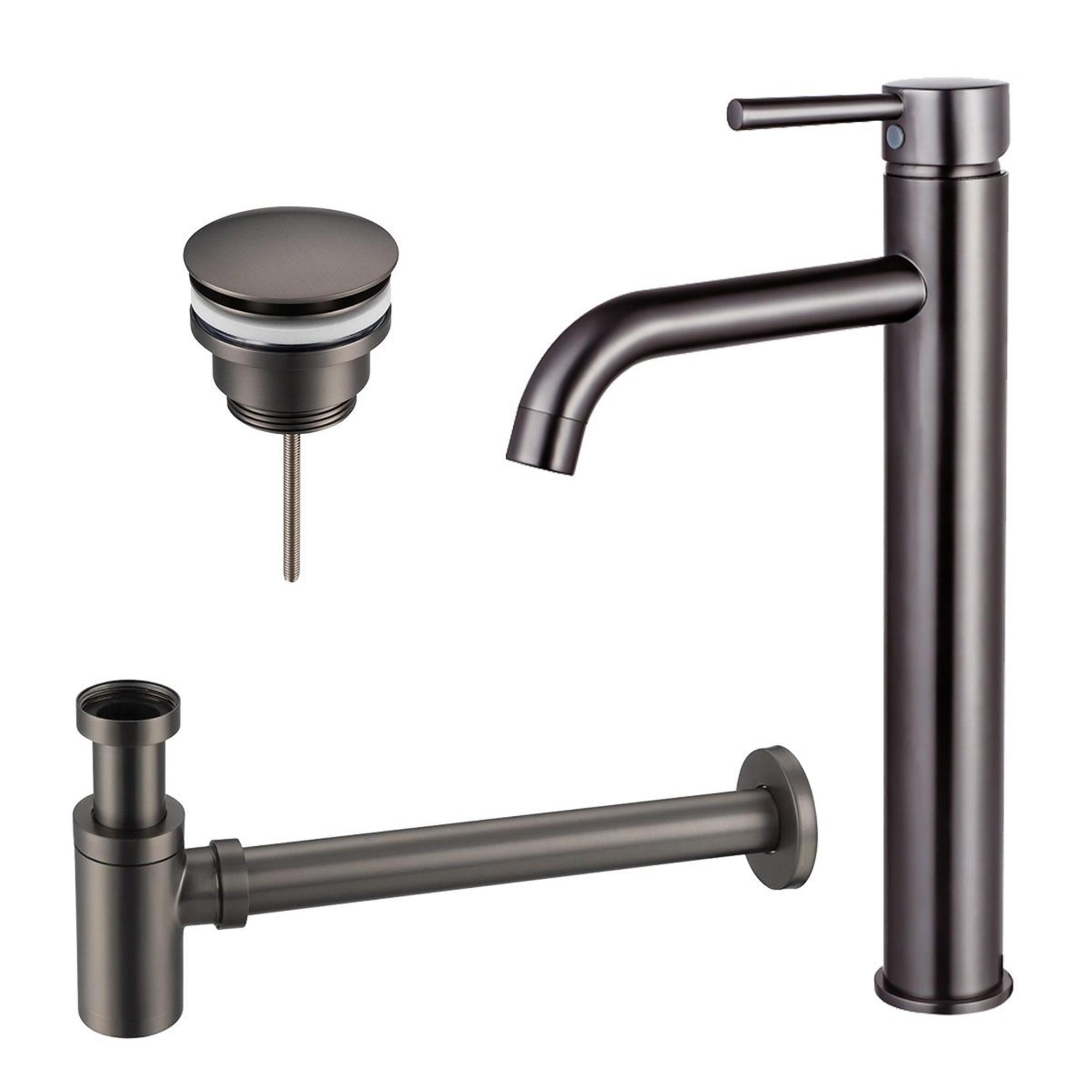 Fortifura Calvi Wastafelkraanset - verhoogde wastafelkraan - klikwaste plug - verlaagde design sifon - Geborsteld Gunmetal PVD