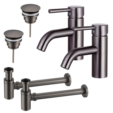 Fortifura Calvi Wastafelkraanset - voor dubbele wastafel - lage wastafelkraan - always open plug - verlaagde design sifon - Geborsteld Gunmetal PVD