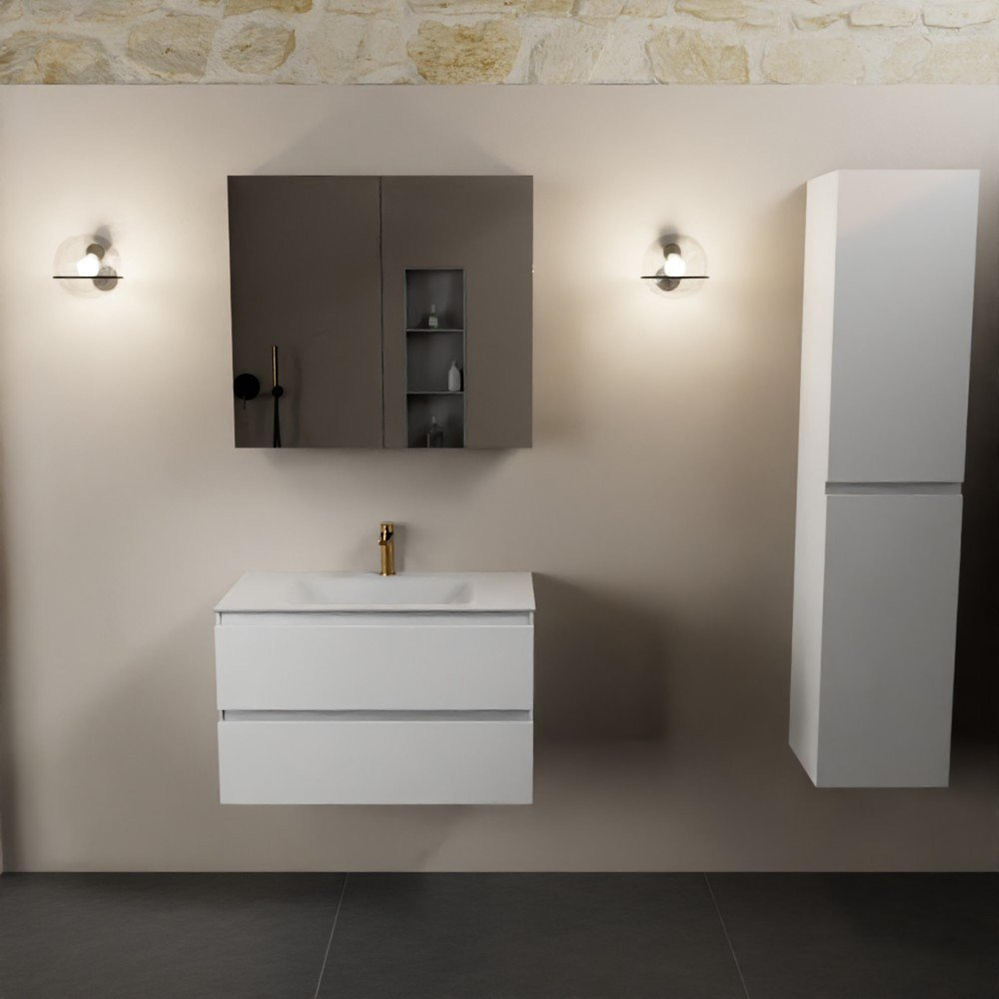Mondiaz Aivy badmeubelset - 80x45x50cm - 1 kraangat - 1 wasbak talc Solid surface - Midden - 2 lades - Met spiegelkast - MDF Talc