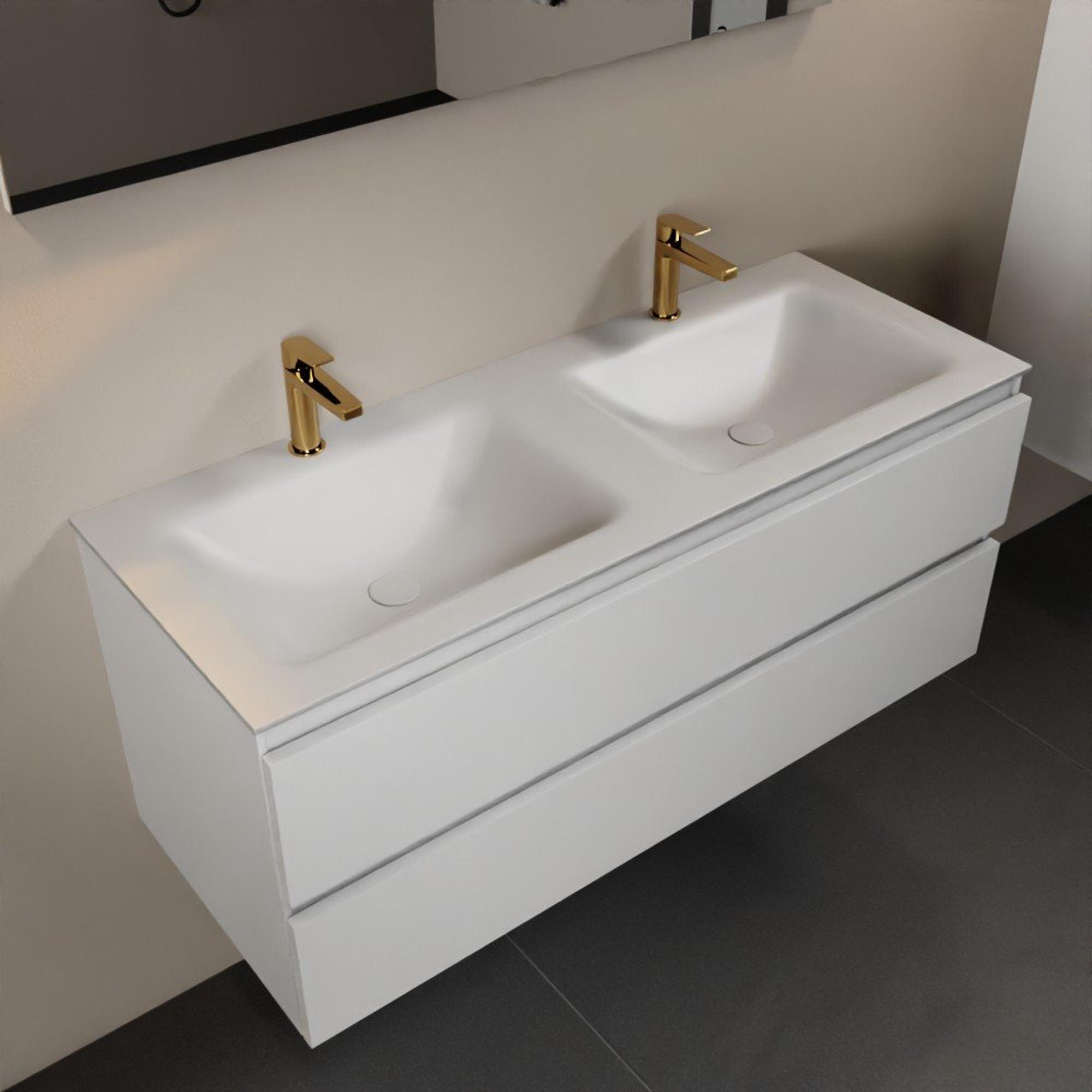 Mondiaz Aivy badmeubelset - 120x45x50cm - 2 kraangaten - 2 wasbakken talc Solid surface - Links en rechts - 2 lades - Met spiegel - MDF Talc