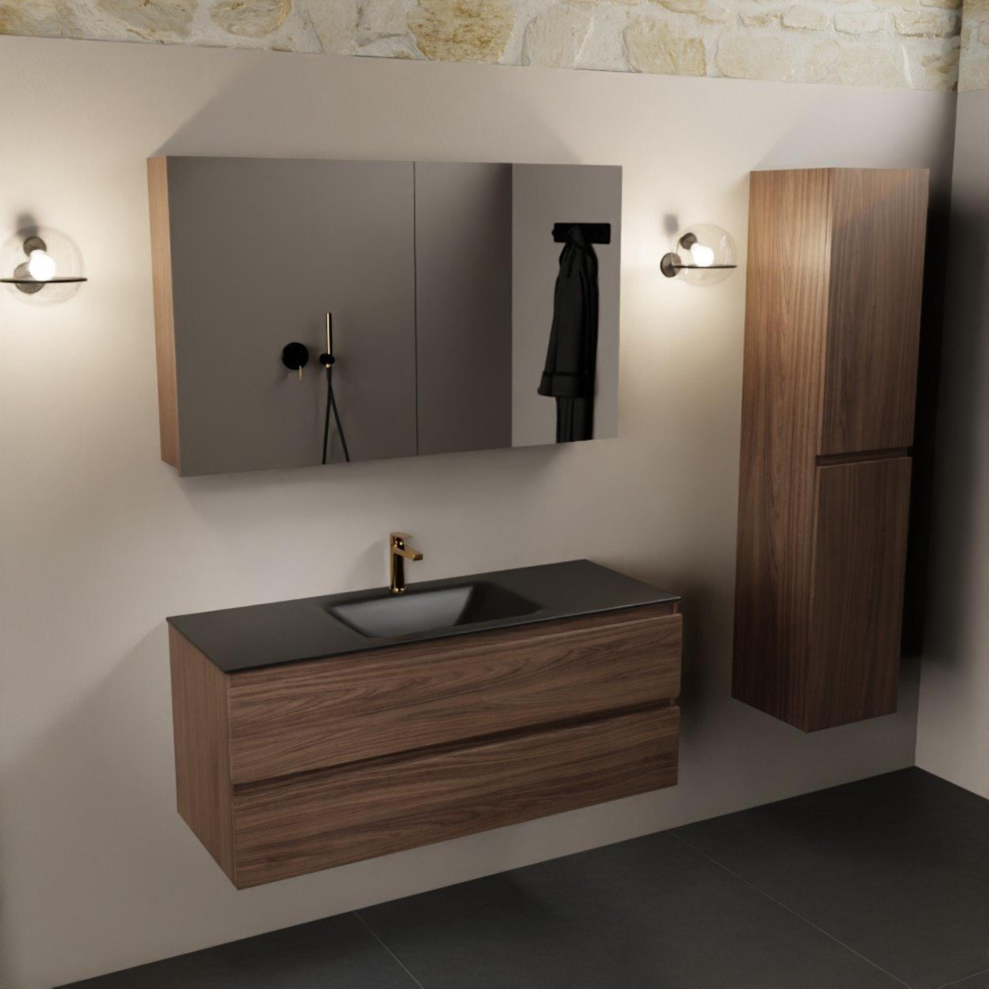 De Mondiaz Aivy badmeubelset kan worden omschreven als stijlvol dankzij zijn strakke lijnen en moderne design. Het kraangat en de wasbak van Solid surface voegen een eigentijdse touch toe aan de badkamer. De middenpositie van de wasbak zorgt voor een gebalanceerde uitstraling, terwijl de subtiele details zoals de lades en spiegelkast de algehele elegantie versterken.