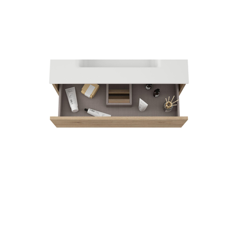 De Adema Chaci PLUS Wastafelonderkast kan worden omschreven als prachtig. De eikenkleurige MFC-afwerking geeft een warme en uitnodigende uitstraling aan de badkamer. De strakke lijnen en geïntegreerde greep zorgen voor een minimalistisch en eigentijds ontwerp dat perfect past bij diverse badkamerstijlen. Deze kast voegt niet alleen functionaliteit toe, maar dient ook als een decoratief element dat de ruimte verfraait.