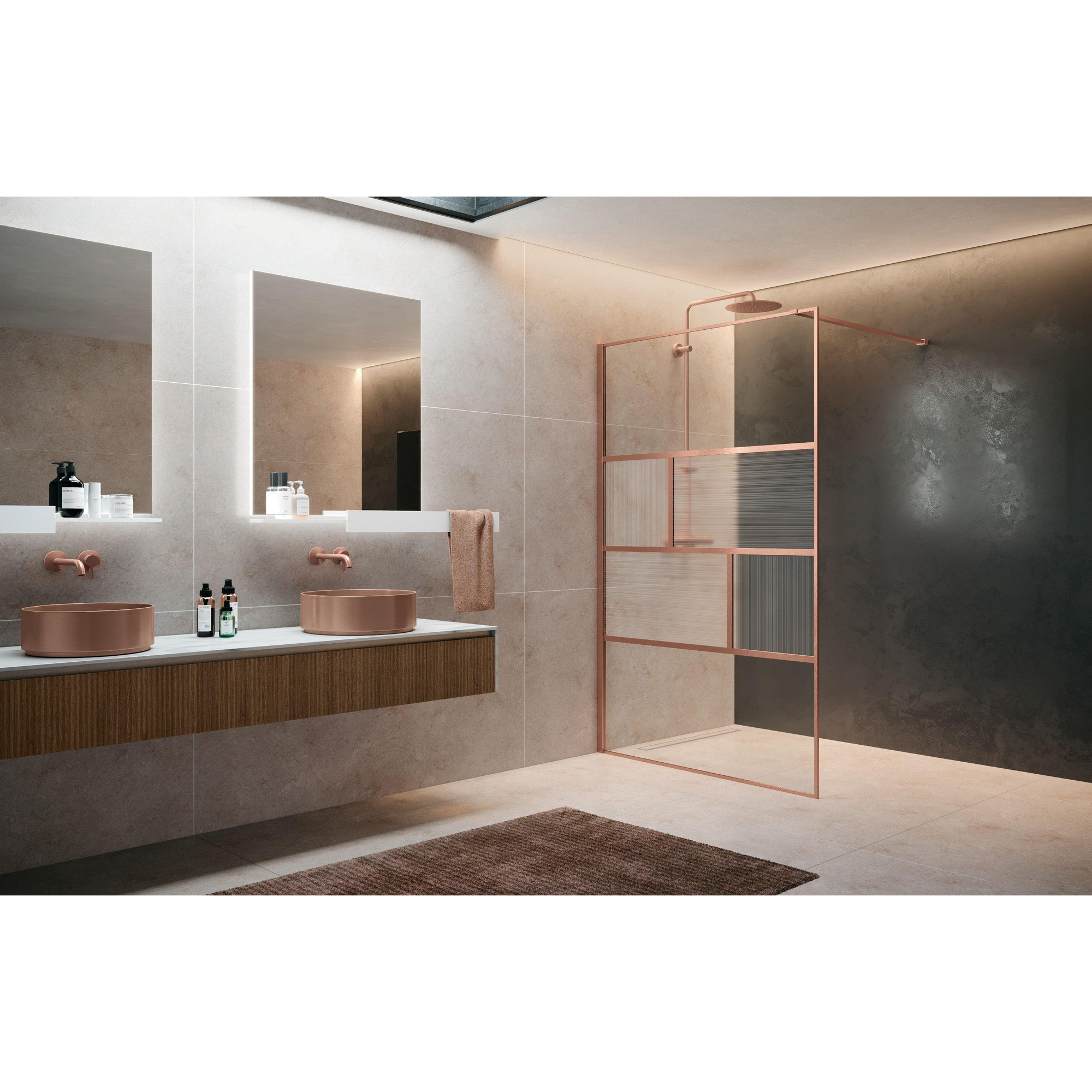 Met zijn glanzende rode gouden (koperen) afwerking straalt de Novellini H art Inloopdouche een ongeëvenaarde stijl uit. Het minimalistische ontwerp past perfect bij moderne en klassieke badkamers en voegt een vleugje glamour toe aan de ruimte. De strakke lijnen en het gebruik van hoogwaardige materialen benadrukken het vakmanschap achter dit prachtige product.