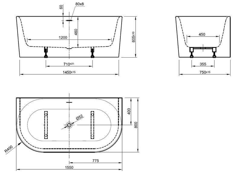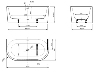 Plieger Kansas Halfvrijstaand bad - 155x80x60cm - met slotoverloop - met af- en overloopgarnituur - met poten - acryl - wit