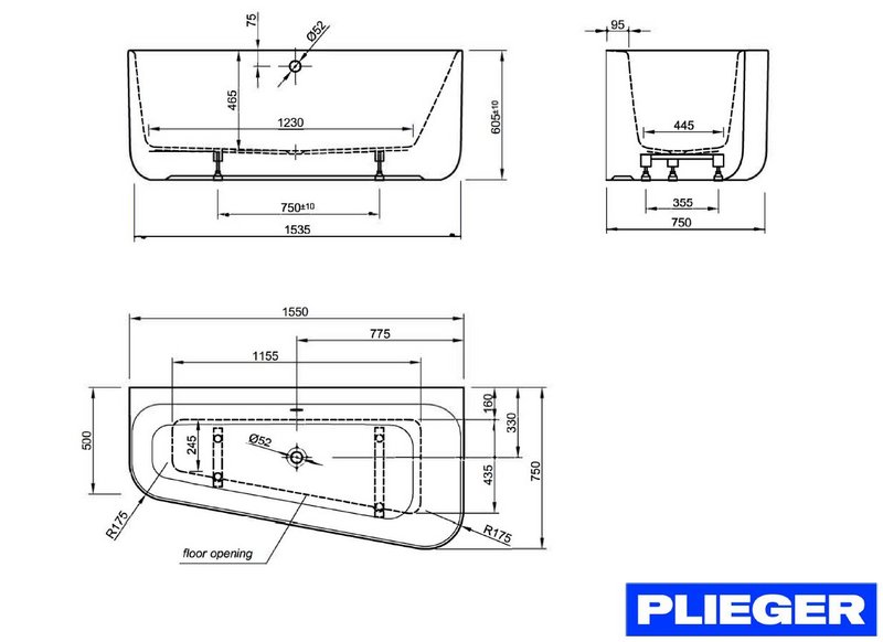 Plieger Kansas Halfvrijstaand bad - 155x75/50x60cm - schuin rechts - met slotoverloop - met af- en overloopgarnituur - met poten - acryl - wit