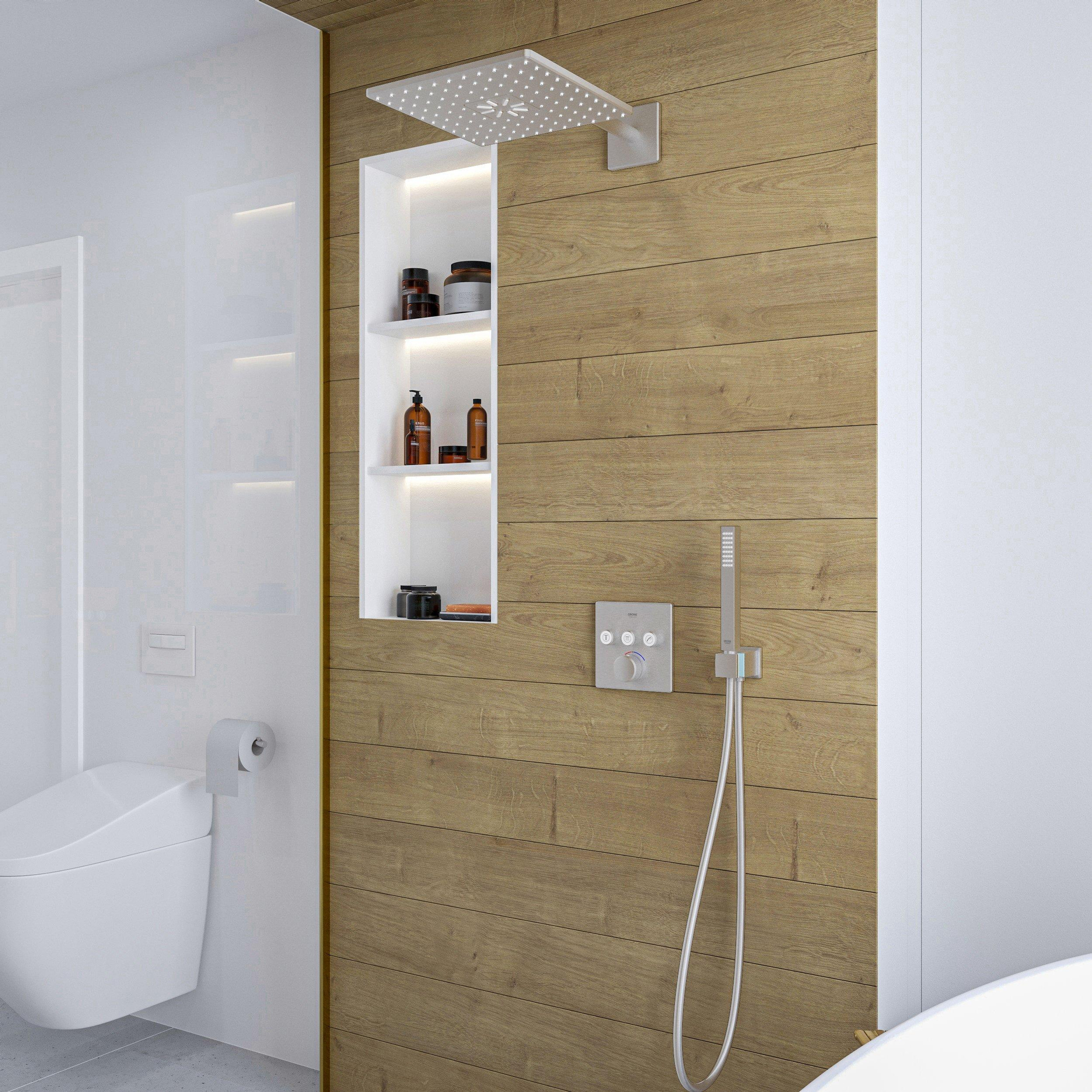 De GROHE SmartControl is er in een elegante inbouwversie die maximaal 4,3 cm uit de muur steekt. Naast de ruimte die deze inbouwversie bespaart is het ook nog een makkelijk schoon te maken. Er is een ronde en een vierkante variant verkrijgbaar met en zonder houder voor een handdouche en met of zonder thermostaat.