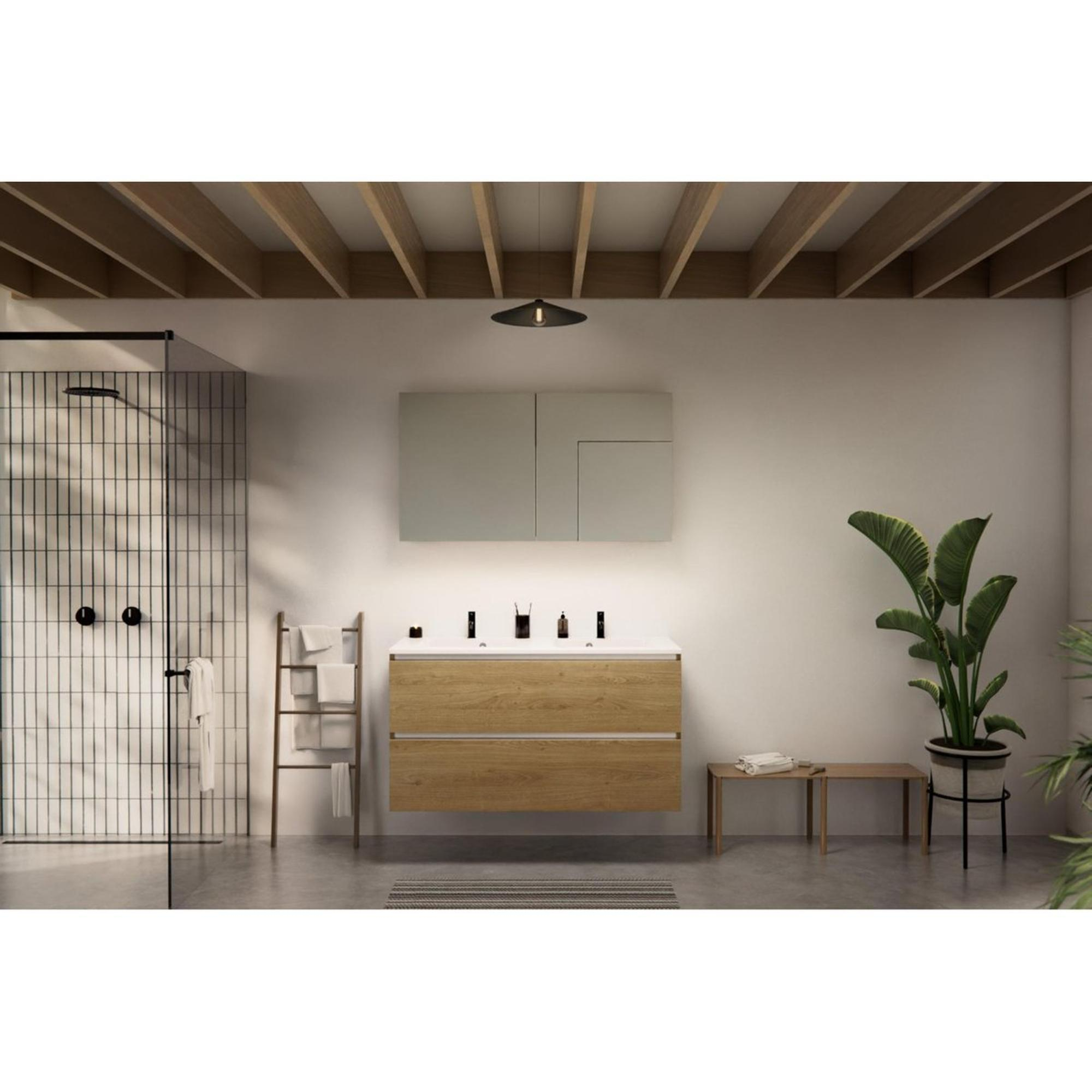 Nemo Start badkamermeubelset - 120x65x49.5cm - 2 lades - greeploos - 2 wasbakken wit glans - 2 kraangaten - met spiegelkast - MDF Riverside Oak