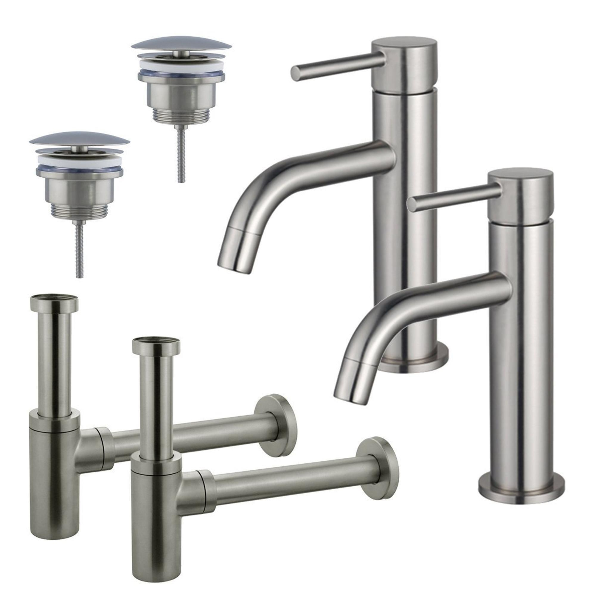 Fortifura Calvi Slim Wastafelkraanset - voor dubbele wastafel - lage wastafelkraan - always open plug - design sifon - PVD Geborsteld RVS