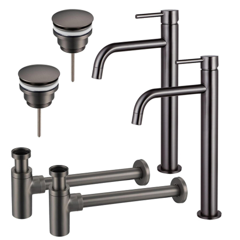 Fortifura Calvi Slim Wastafelkraanset - voor dubbele wastafel - verhoogde wastafelkraan - klikwaste plug - design sifon - Geborsteld Gunmetal PVD