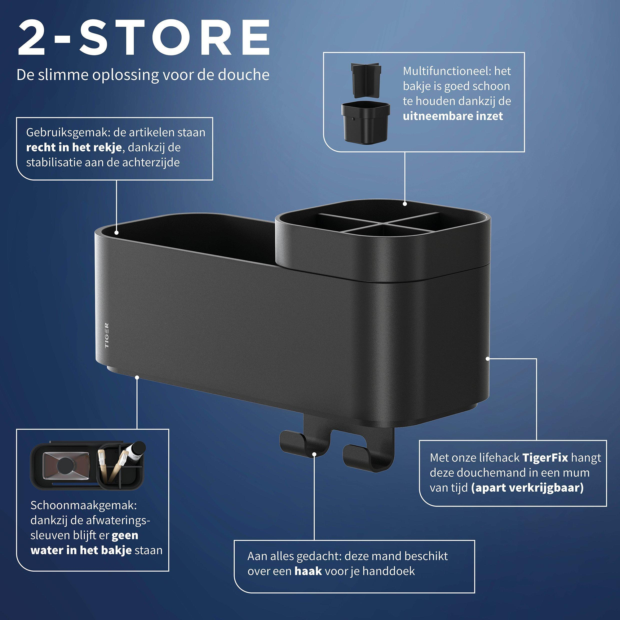 Het Tiger 2-Store Opbergbakje is niet alleen mooi, maar ook zeer praktisch in gebruik. De handdoekhaak zorgt ervoor dat je handdoek altijd binnen handbereik is en netjes kan drogen. De tandenborstelhouder biedt een handige opbergplek voor je tandenborstels, waardoor je wastafel vrij blijft van rommel. De stevige constructie zorgt ervoor dat het bakje veilig aan de muur kan worden bevestigd, zonder zorgen over vallen of verschuiven.