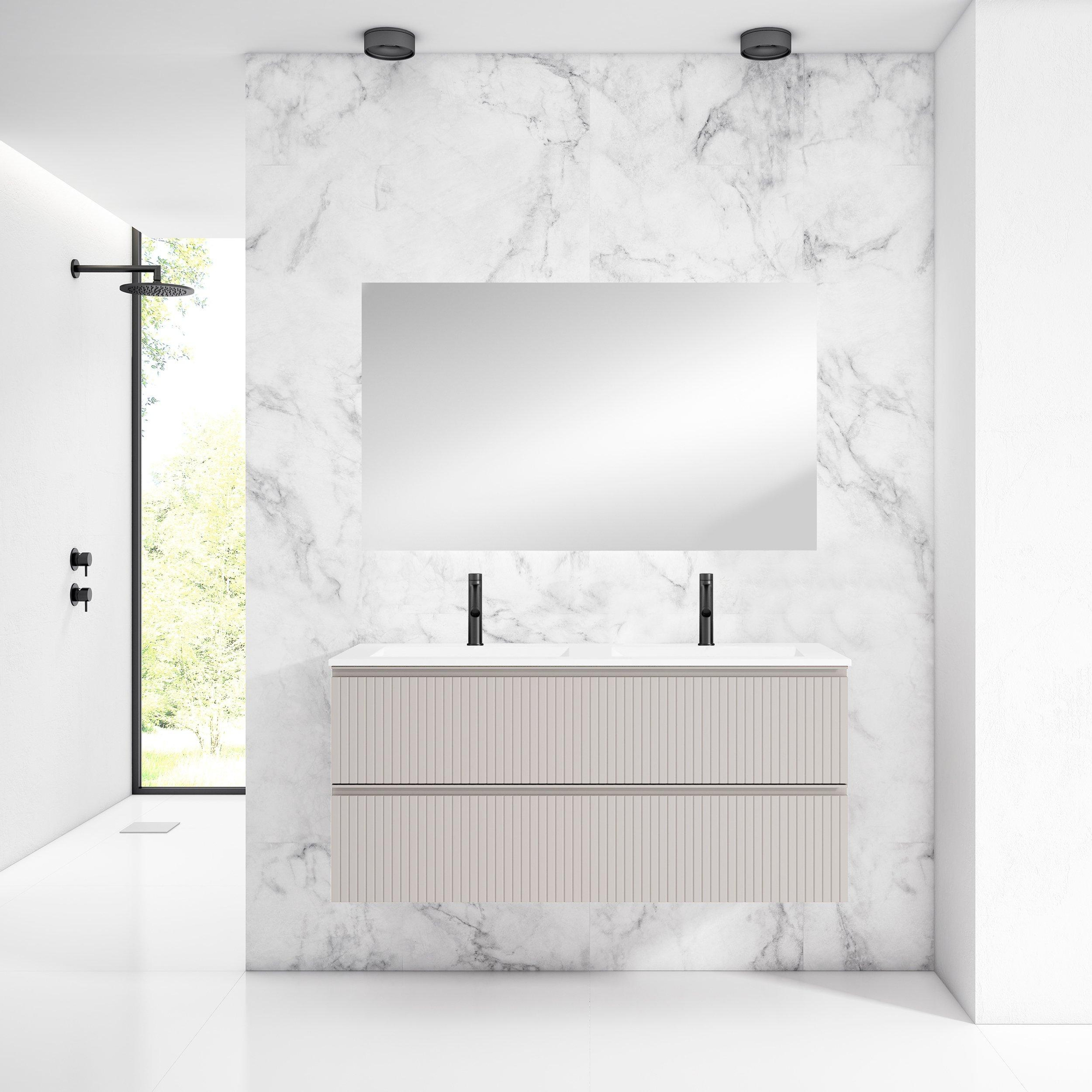 Adema Prime Blend Badkamermeubelset - 120x55x46cm - 2 rechthoekige keramische wasbakken wit - 2 kraangaten - 2 lades - rechthoekige spiegel - mat cotton (beige)