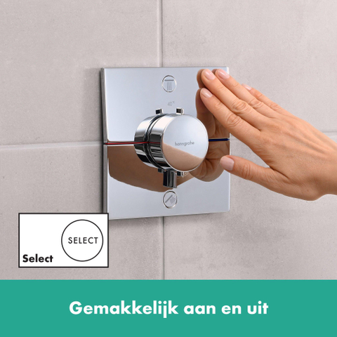 Het gebruiksgemak is net zo indrukwekkend als het design: de bovenste en onderste helft van de thermostaatkraan dienen als grote knoppen die het water aan en uit zetten (Select). Gelijktijdig gebruik van beide functies (bijvoorbeeld hoofd- en handdouche) is ook mogelijk. Via de slanke onderste greep kan de hoeveelheid water naar wens worden aangepast. De thermostaatkraan houdt de gewenste temperatuur altijd constant en past zich indien nodig automatisch aan.