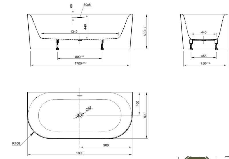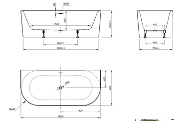 Plieger Kansas Halfvrijstaand bad - 180x80x60cm - met slotoverloop - met af- en overloopgarnituur - met poten - acryl - mat zwart