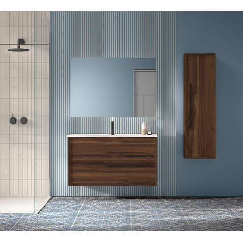 Adema Prime Essential Badkamermeubelset - 100x55x46cm - 1 rechthoekige wasbak wit - 1 kraangat - 2 lades - rechthoekige spiegel - noten (hout)