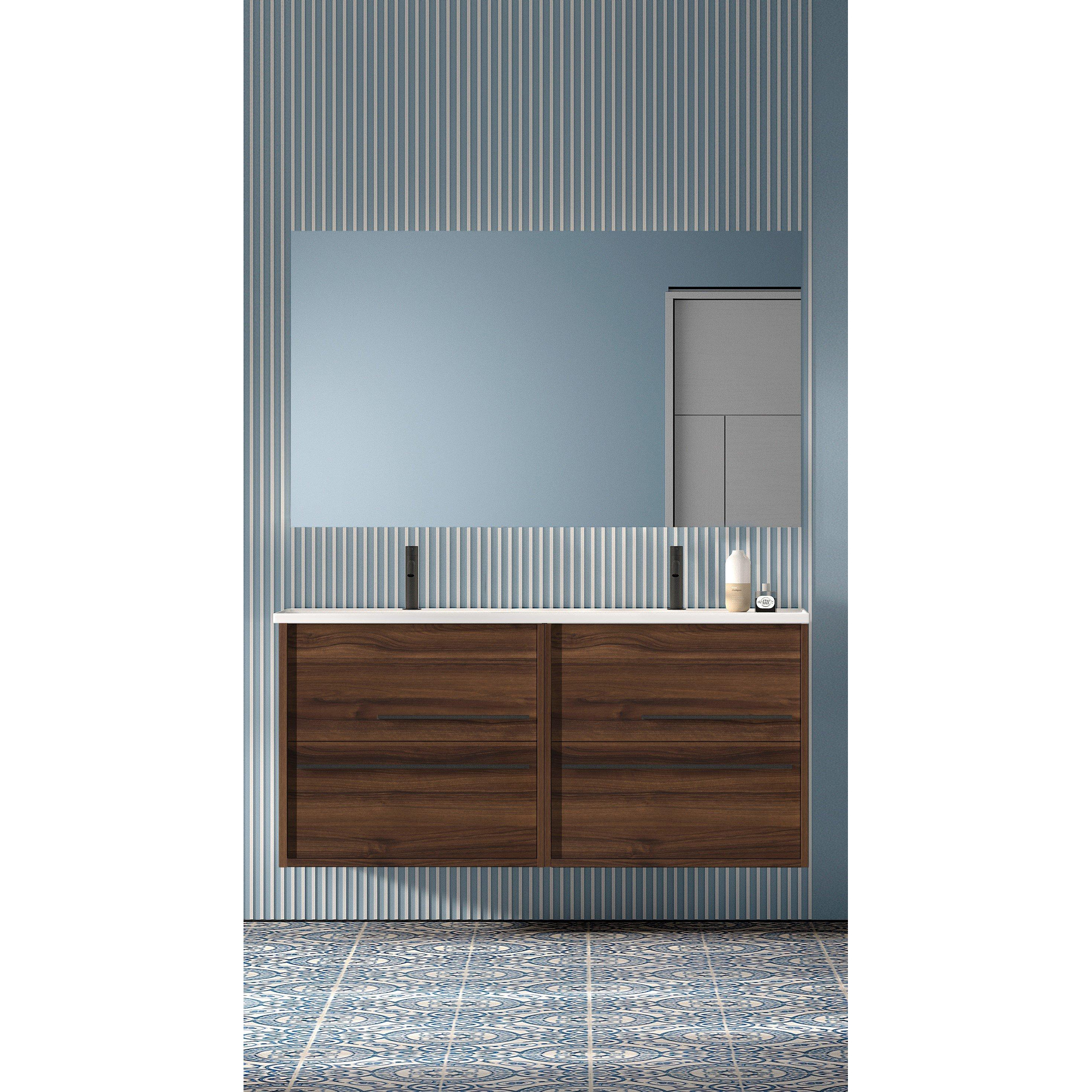 Dit badkamermeubelset straalt stijl en elegantie uit dankzij de twee rechthoekige wasbakken in het wit, die perfect passen bij de noten (hout) afwerking. De rechthoekige spiegel voegt een moderne touch toe en maakt de set compleet. De strakke lijnen en subtiele details zorgen voor een tijdloze uitstraling die moeiteloos past bij verschillende interieurstijlen.