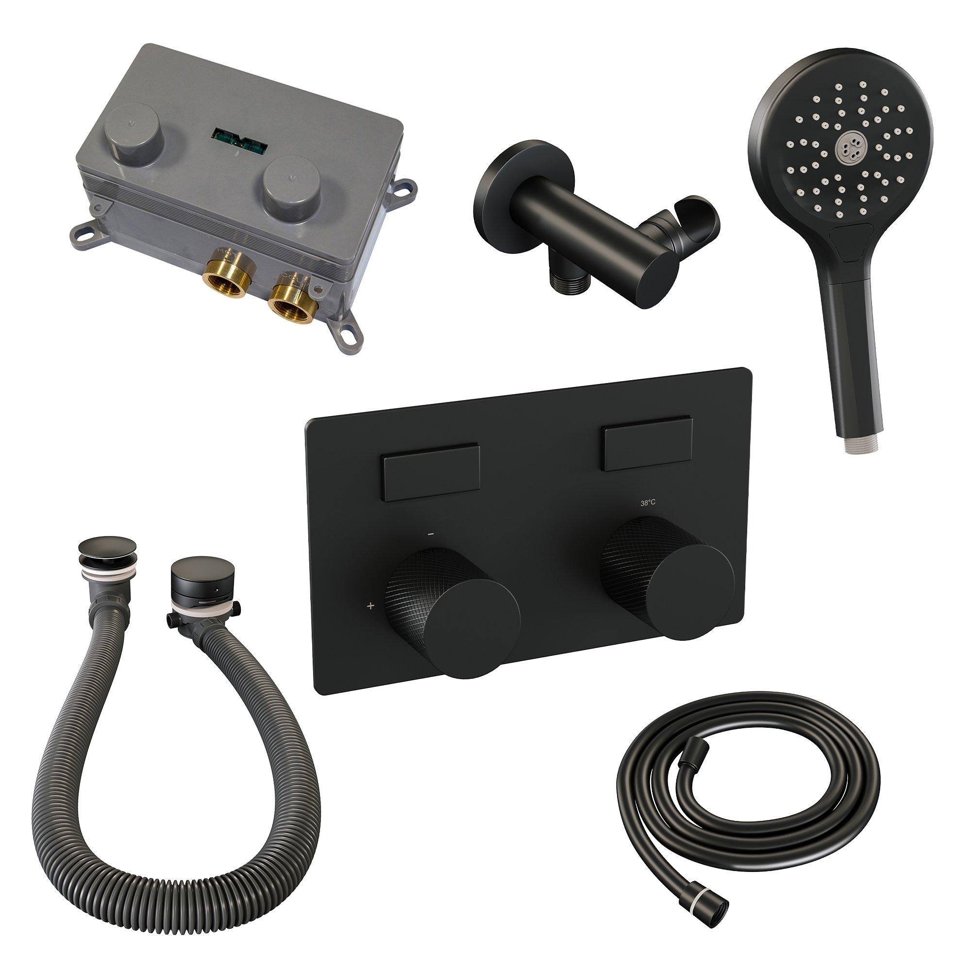 BRAUER Black Carving thermostatische inbouw badkraan - drukknoppen SET 04 - badvulcombinatie - 3 standen handdouche - doucheslang - wandaansluitbocht - zwart mat