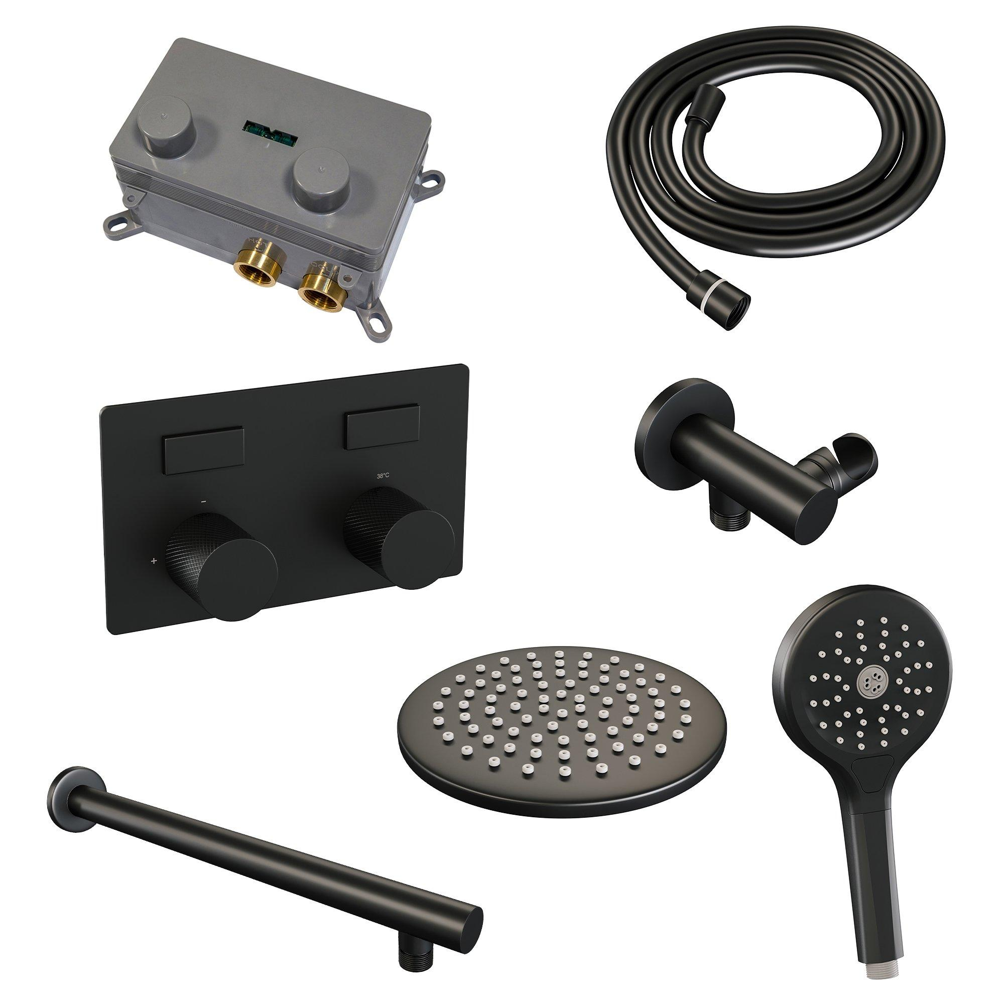 BRAUER Black Carving Thermostatische Regendouche inbouw - drukknoppen - SET 55 - 20cm hoofddouche - rechte muurarm - 3 standen handdouche - doucheslang - wandaansluitbocht - zwart mat